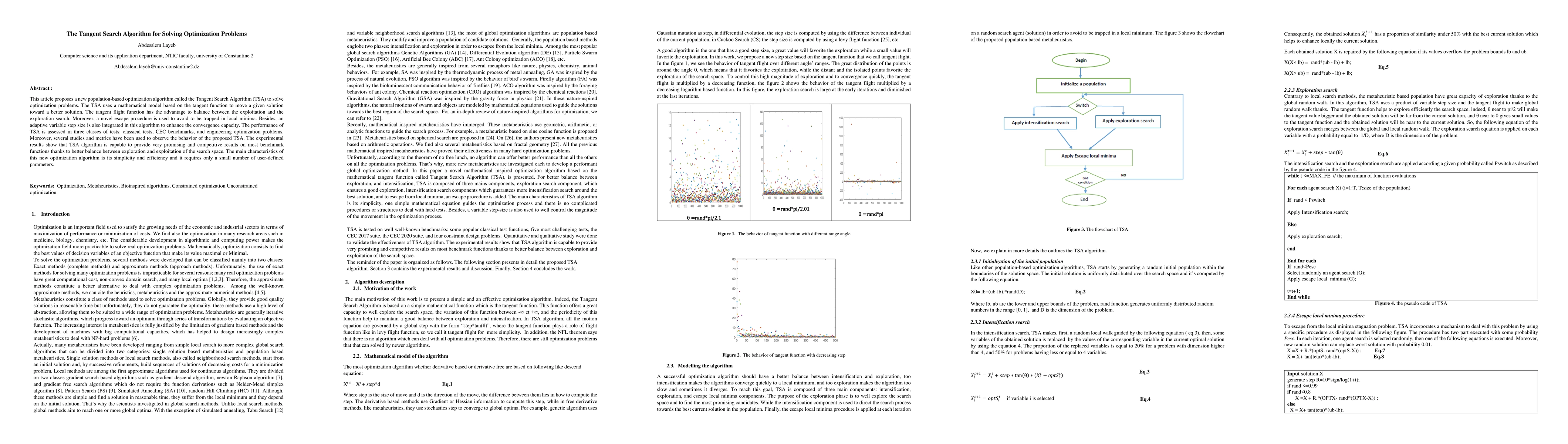 The Tangent Search Algorithm (TSA) is a novel population-based optimization method that leverages a tangent function model to balance exploration and exploitation, avoiding local minima and enhancing convergence. TSA's performance is competitive across various optimization tests, demonstrating its simplicity and efficiency with minimal user parameters.