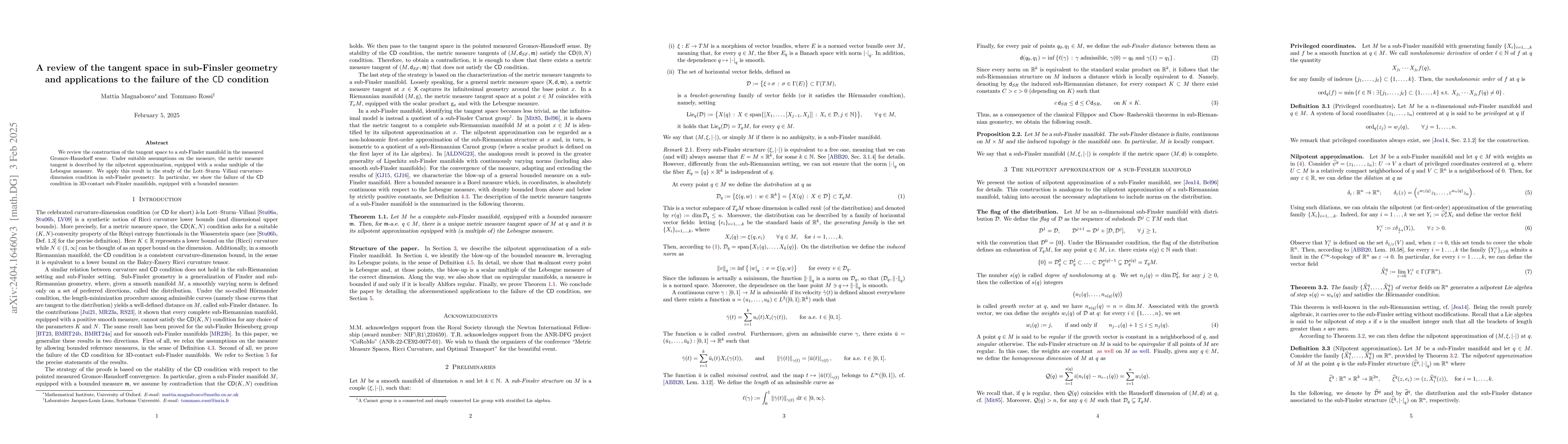 This paper investigates the tangent space of sub-Finsler manifolds using the Gromov-Hausdorff sense, proving a nilpotent approximation metric tangent. It also explores the blow-up of measures, introducing a bounded measure concept leading to scalar multiples of the Lebesgue measure in the limit, with applications to the Lott-Sturm-Villani curvature-dimension condition, particularly highlighting the failure of the CD condition in equiregular sub-Finsler manifolds with growth vector (2,3).