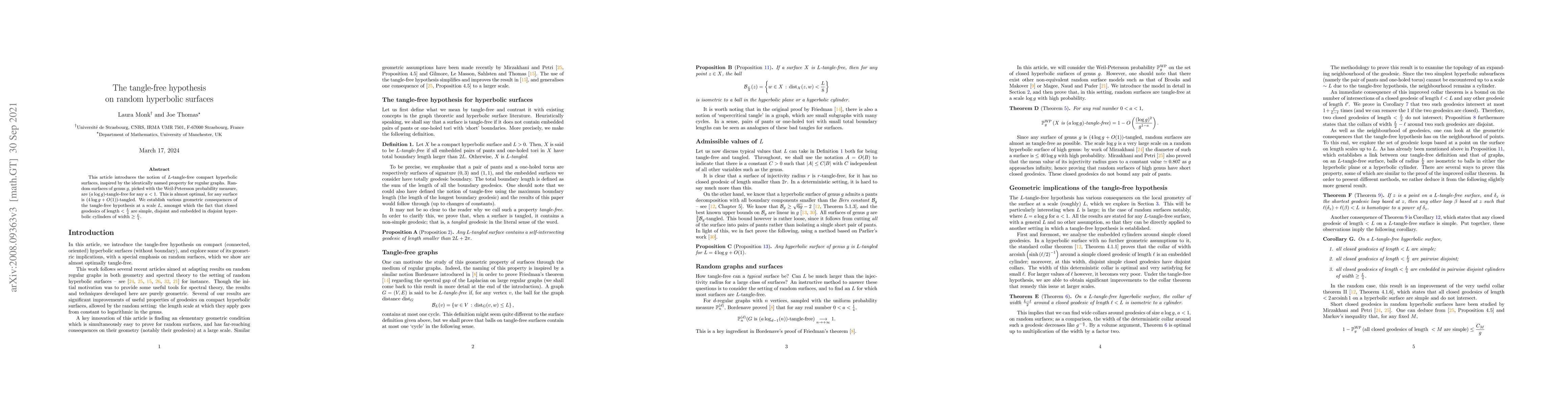 This paper explores L-tangle-free compact hyperbolic surfaces and demonstrates that random surfaces of genus g are (a log g)-tangle-free for a < 1. It concludes that the hypothesis leads to simple, disjoint, and embedded closed geodesics within hyperbolic cylinders of width ≥ L/4.