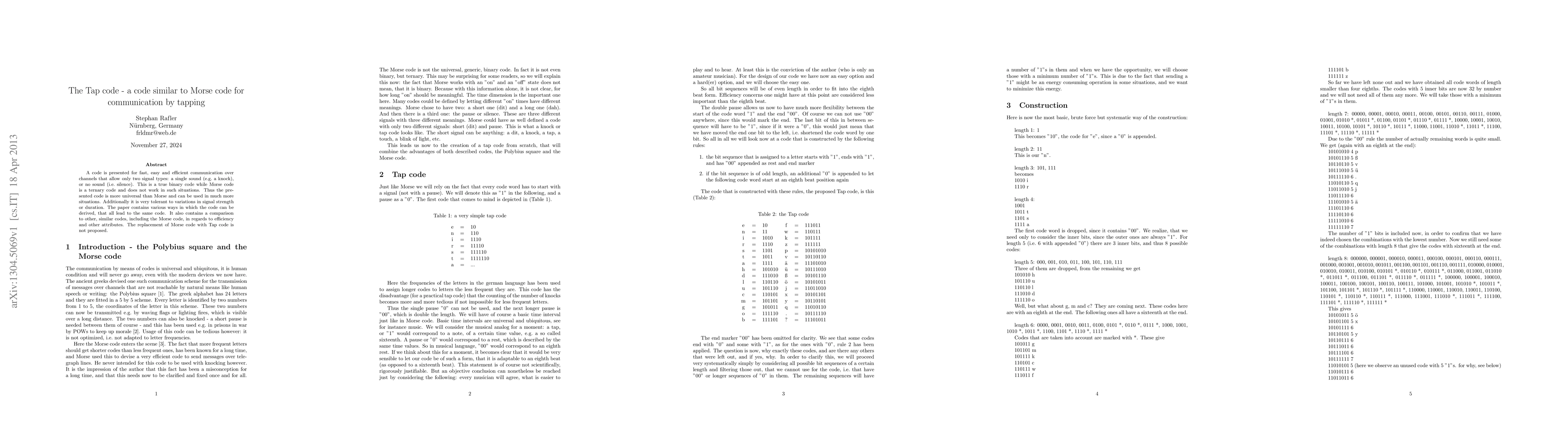 The paper introduces the Tap code, a binary code for communication using only two signal types, unlike Morse code. It's efficient, universal, and tolerant to signal variations. Various derivation methods are presented, compared to other codes, without proposing its replacement for Morse code.