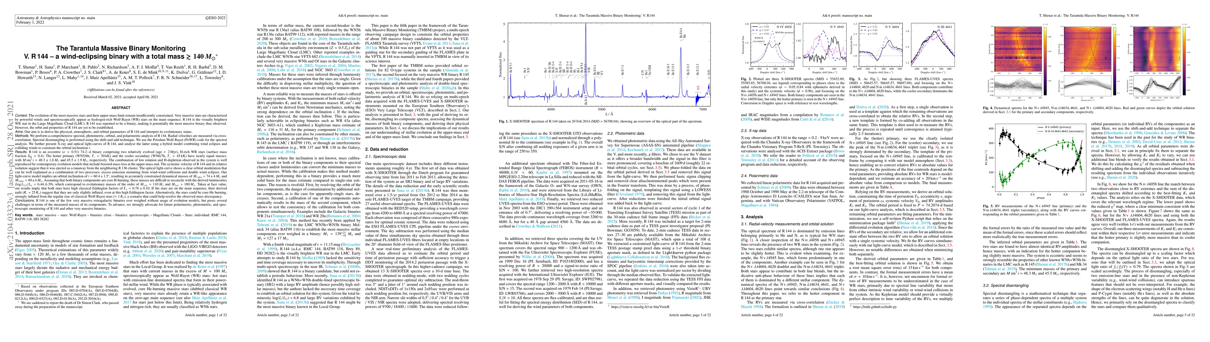 R 144 is the visually brightest WR star in the Large Magellanic Cloud (LMC). R 144 was reported to be a binary, making it potentially the most massive binary thus observed. We perform a comprehensive spectral, photometric, orbital, and polarimetric analysis of R 144. R 144 is an eccentric (e=0.51) 74.2-d binary comprising two relatively evolved (age~2 Myr), H-rich WR stars. The hotter primary (WN5/6h, T=50 kK) and the cooler secondary (WN6/7h,T=45kK) have nearly equal masses. The combination of low rotation and H-depletion observed in the system is well reproduced by contemporary evolution models that include boosted mass-loss at the upper-mass end. The systemic velocity of R 144 and its relative isolation suggest that it was ejected as a runaway from the neighbouring R 136 cluster. The optical light-curve shows a clear orbital modulation that can be well explained as a combination of two processes: excess emission stemming from wind-wind collisions and double wind eclipses. Our light-curve model implies an orbital inclination of i=60.4+-1.5deg, resulting in accurately constrained dynamical masses of 74+-4 and 69+-4 Msun. Assuming that both binary components are core H-burning, these masses are difficult to reconcile with the derived luminosities (logL1,2 = 6.44, 6.39 [Lsun]), which correspond to evolutionary masses of the order of 110 and 100Msun, respectively. Taken at face value, our results imply that both stars have high classical Eddington factors of Gamma_e = 0.78+-0.1. If the stars are on the main sequence, their derived radii (~25Rsun) suggest that they are only slightly inflated, even at this high Eddington factor. Alternatively, the stars could be core-He burning, strongly inflated from the regular size of classical Wolf-Rayet stars (~1Rsun), a scenario that could help resolve the observed mass discrepancy.