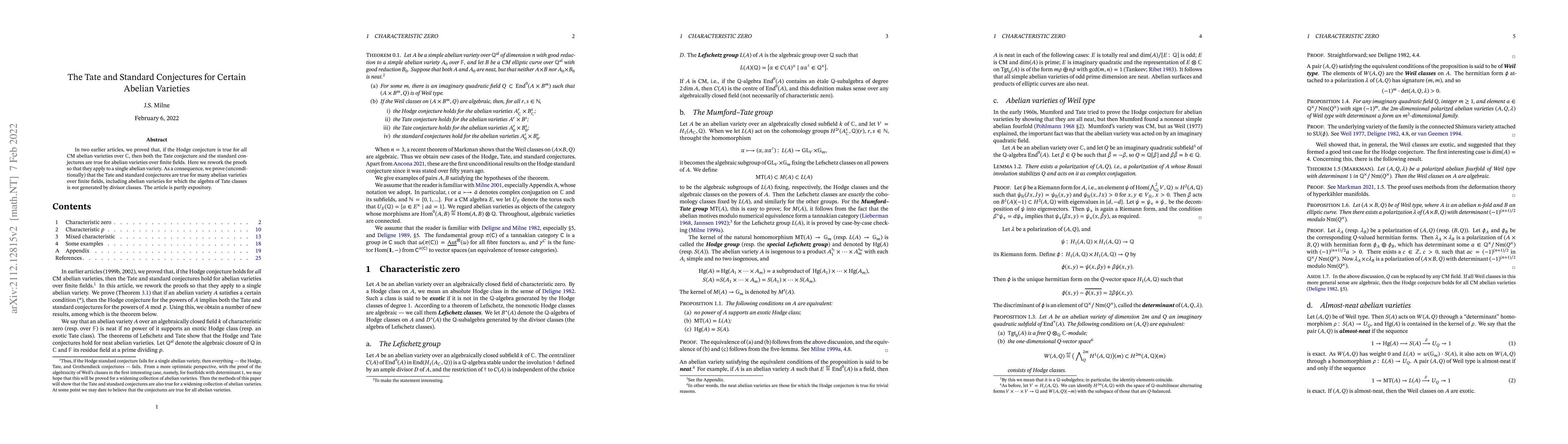 This paper reworks earlier proofs to show that the Tate and standard conjectures hold for individual abelian varieties over finite fields, even when the algebra of Tate classes isn't generated by divisor classes, provided the Hodge conjecture is true for all CM abelian varieties over the complex numbers.