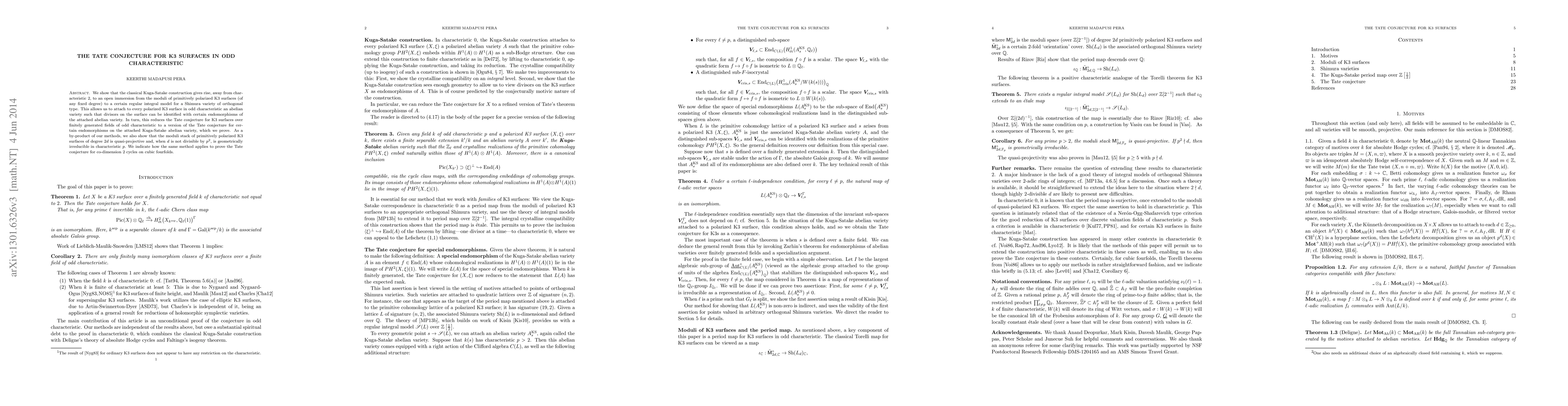 The paper demonstrates the Tate conjecture for K3 surfaces in odd characteristic through a connection between K3 surfaces and Kuga-Satake abelian varieties, proving the conjecture for endomorphisms on the latter. Additionally, it shows that the moduli stack of primitively polarized K3 surfaces is quasi-projective and geometrically irreducible in characteristic p.