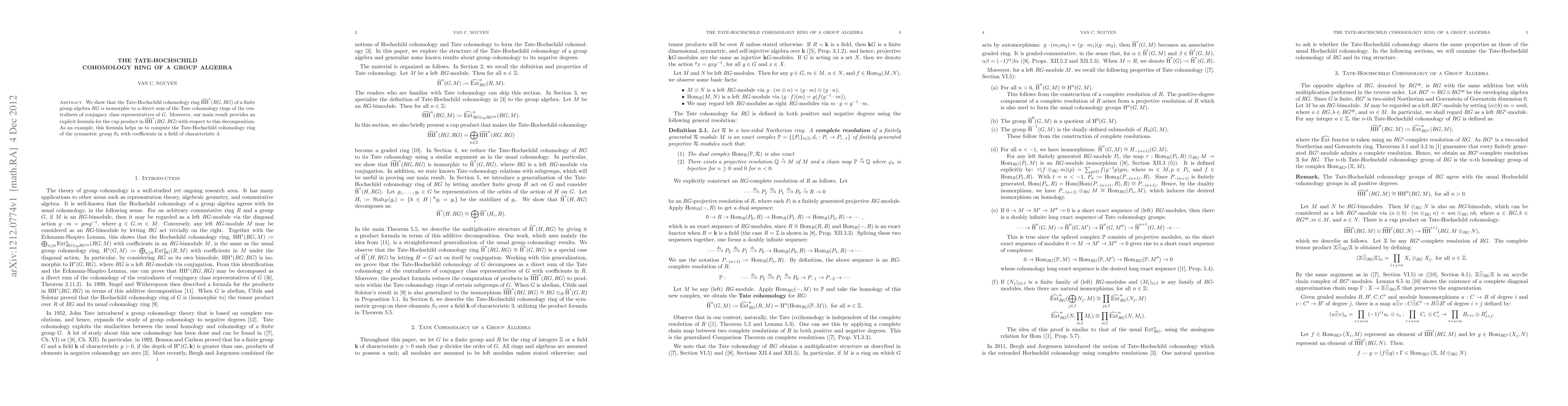 We show that the Tate-Hochschild cohomology ring $HH^*(RG,RG)$ of a finite group algebra $RG$ is isomorphic to a direct sum of the Tate cohomology rings of the centralizers of conjugacy class representatives of $G$. Moreover, our main result provides an explicit formula for the cup product in $HH^*(RG,RG)$ with respect to this decomposition. As an example, this formula helps us to compute the Tate-Hochschild cohomology ring of the symmetric group $S_3$ with coefficients in a field of characteristic 3.