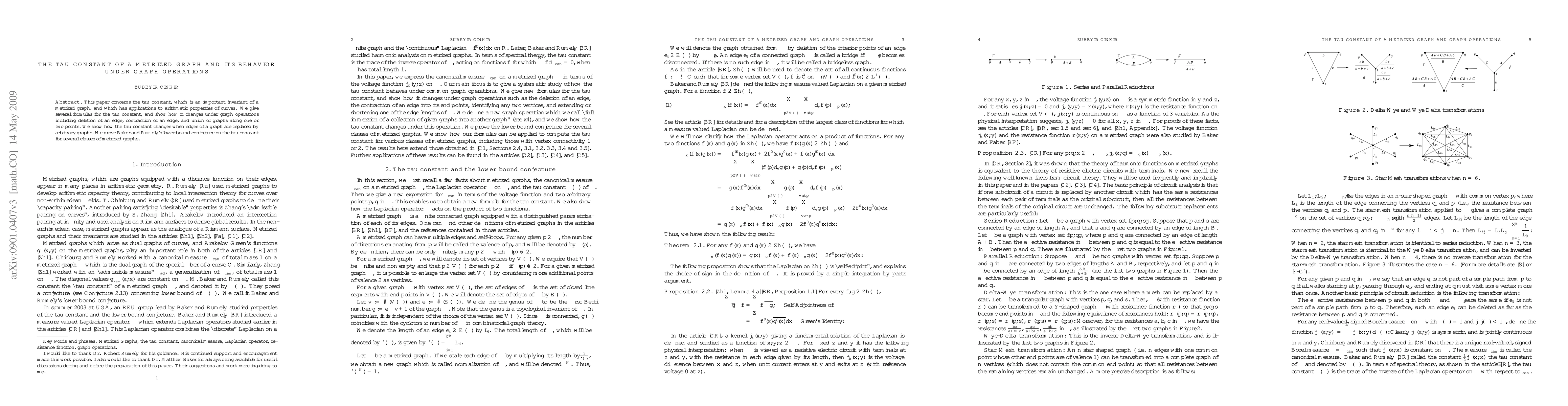 This paper concerns the tau constant, which is an important invariant of a metrized graph, and which has applications to arithmetic properties of curves. We give several formulas for the tau constant, and show how it changes under graph operations including deletion of an edge, contraction of an edge, and union of graphs along one or two points. We show how the tau constant changes when edges of a graph are replaced by arbitrary graphs. We prove Baker and Rumely's lower bound conjecture on the tau constant for several classes of metrized graphs.
