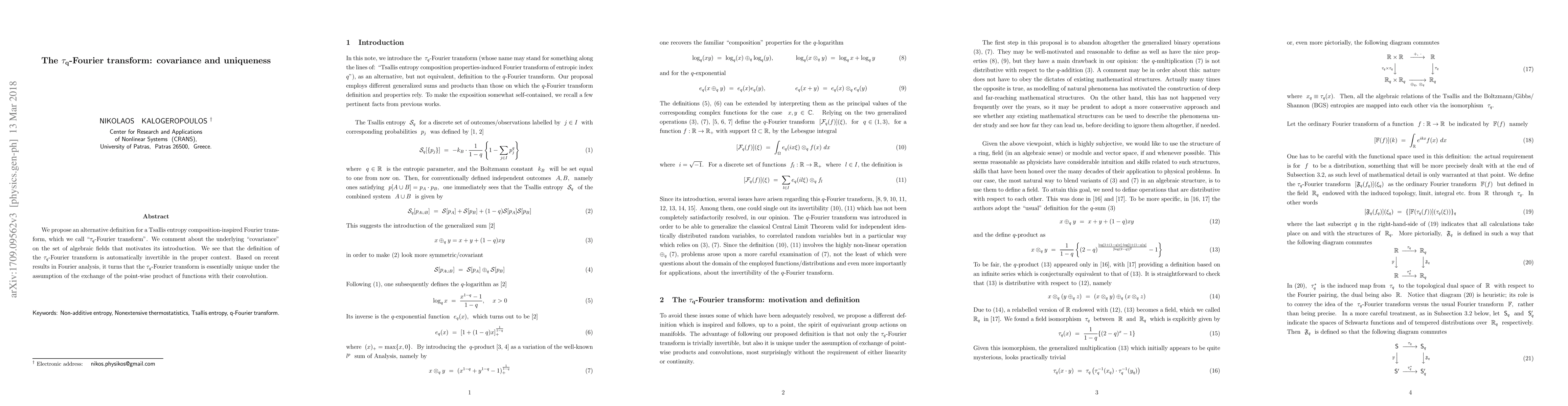 We propose an alternative definition for a Tsallis entropy composition-inspired Fourier transform, which we call "$\tau_q$-Fourier transform". We comment about the underlying "covariance" on the set of algebraic fields that motivates its introduction. We see that the definition of the $\tau_q$-Fourier transform is automatically invertible in the proper context. Based on recent results in Fourier analysis, it turns that the $\tau_q$-Fourier transform is essentially unique under the assumption of the exchange of the point-wise product of functions with their convolution.