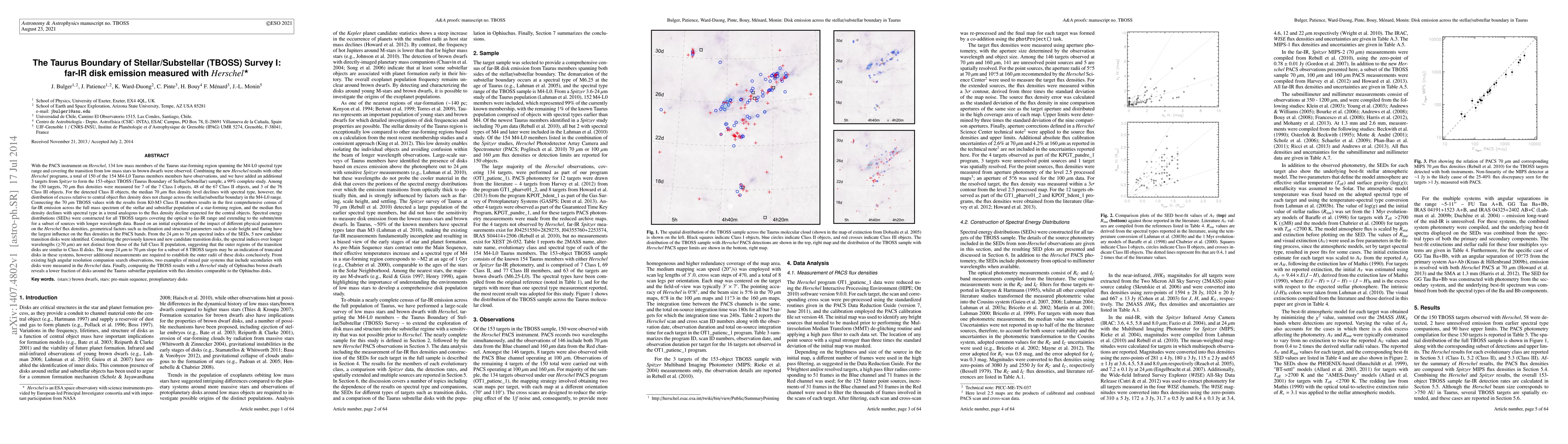 With Herschel/PACS 134 low mass members of the Taurus star-forming region spanning the M4-L0 spectral type range and covering the transition from low mass stars to brown dwarfs were observed. Combining the new Herschel results with other programs, a total of 150 of the 154 M4-L0 Taurus members members have observations with Herschel. Among the 150 targets, 70um flux densities were measured for 7 of the 7 ClassI objects, 48 of the 67 ClassII members, and 3 of the 76 ClassIII targets. For the detected ClassII objects, the median 70um flux density level declines with spectral type, however, the distribution of excess relative to central object flux density does not change across the stellar/substellar boundary in the M4-L0 range. Connecting the 70um TBOSS values with the results from K0-M3 ClassII members results in the first comprehensive census of far-IR emission across the full mass spectrum of the stellar and substellar population of a star-forming region, and the median flux density declines with spectral type in a trend analogous to the flux density decline expected for the central objects. SEDs were constructed for all TBOSS targets covering the optical to far-IR range and extending to the submm/mm for a subset of sources. Based on an initial exploration of the impact of different physical parameters; inclination, scale height and flaring have the largest influence on the PACS flux densities. From the 24um to 70um spectral index of the SEDs, 5 new candidate transition disks were identified. The steep 24um to 70um slope for a subset of 8 TBOSS targets may be an indication of truncated disks in these systems.Two examples of mixed pair systems that include secondaries with disks were measured. Finally, comparing the TBOSS results with a Herschel study of Ophiuchus brown dwarfs reveals a lower fraction of disks around the Taurus substellar population.