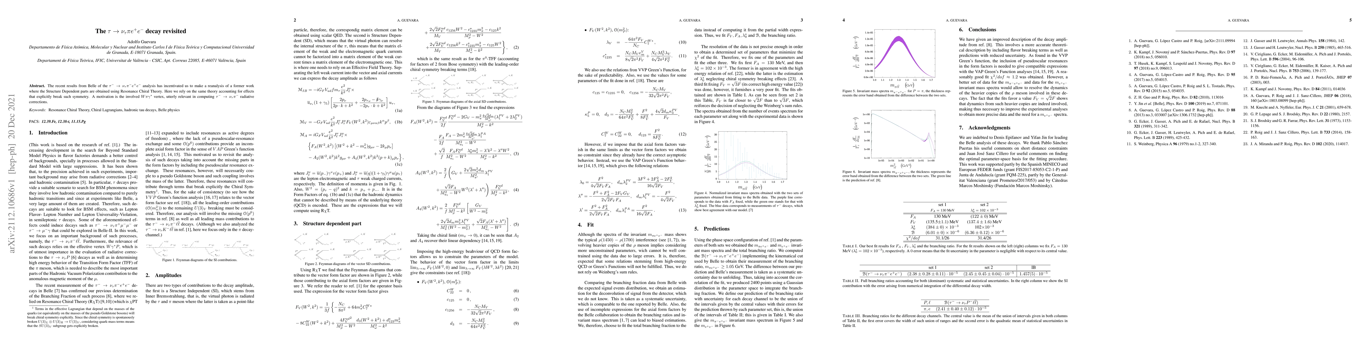 This paper revisits the $\tau^-\to\nu_\tau\pi^-e^+e^-$ decay using Resonance Chiral Theory, incorporating effects that break symmetry, particularly focusing on the $W\pi\gamma^\star$ vertex for radiative corrections. The analysis aims to refine previous results based on new data from Belle.