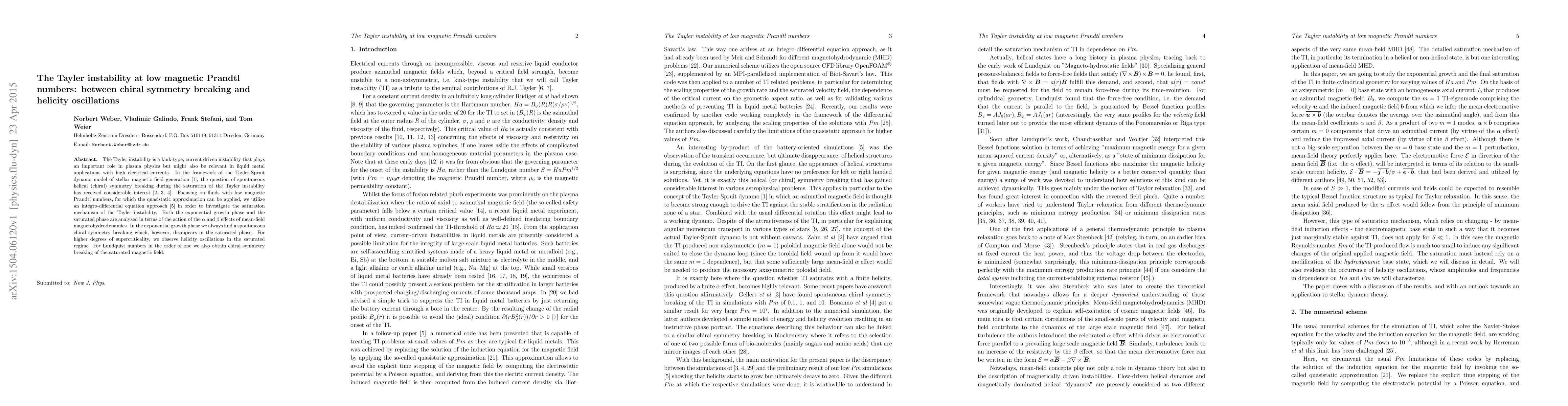 This paper investigates the Tayler instability in low magnetic Prandtl number fluids, revealing spontaneous chiral symmetry breaking during the exponential growth phase, which vanishes in the saturated phase, while helicity oscillations emerge in the supercritical regime.