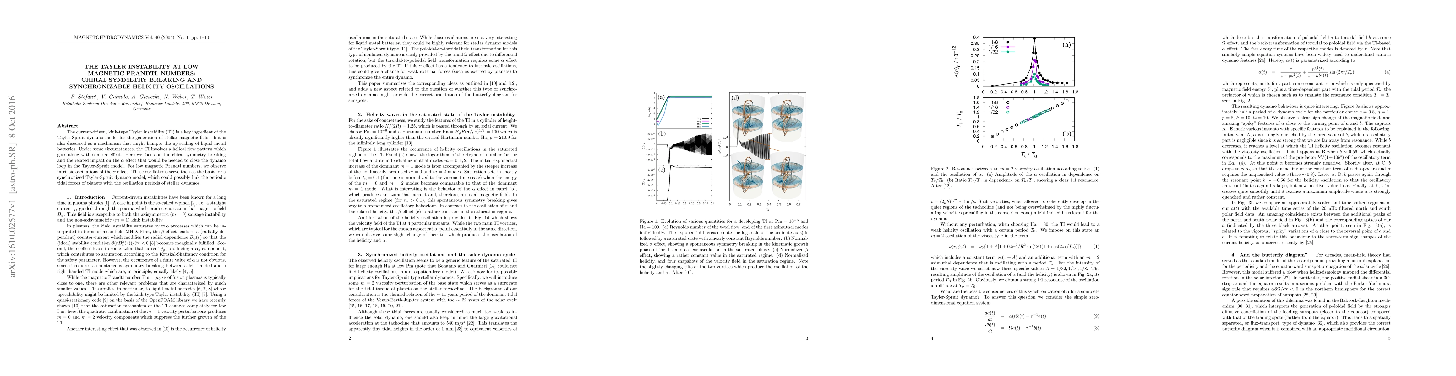 This paper investigates the Tayler instability under low magnetic Prandtl numbers, focusing on chiral symmetry breaking and its effect on the alpha effect. It finds intrinsic oscillations of the alpha effect that enable a synchronized dynamo model, potentially linking stellar dynamo oscillation periods to planetary tidal forces.