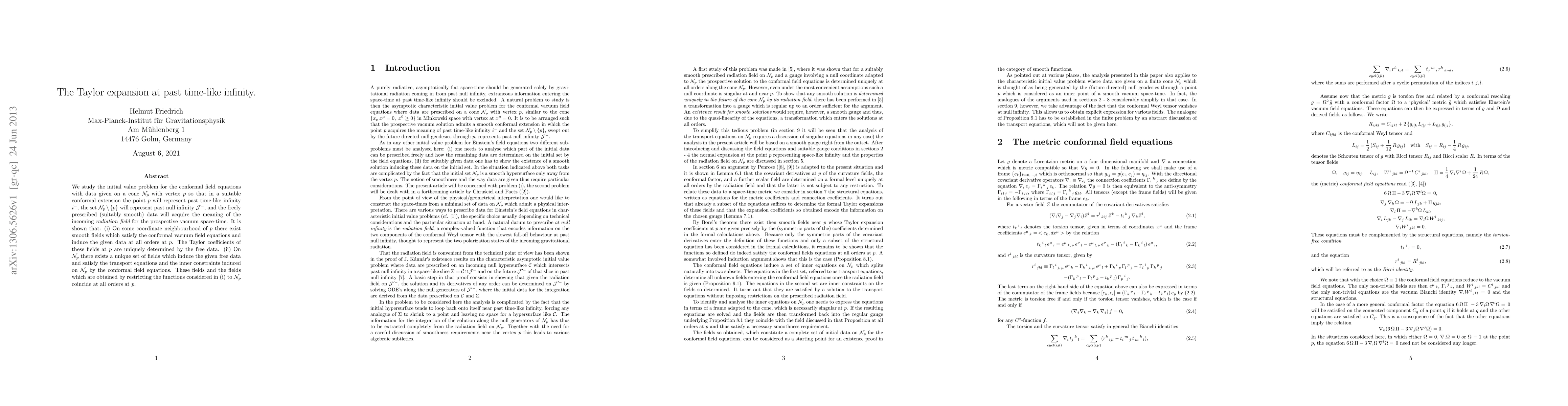 This paper investigates the initial value problem for conformal field equations with data on a cone representing past time-like infinity, showing that smooth fields satisfying the conformal vacuum equations can uniquely determine the Taylor expansion at this point. It also proves the existence of a unique set of fields on the cone that match the given data and satisfy transport equations and inner constraints.
