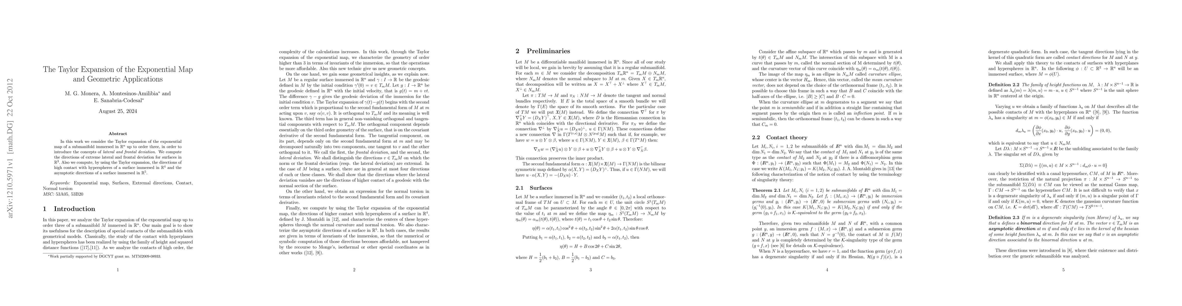 In this work we consider the Taylor expansion of the exponential map of a submanifold immersed in R^n up to order three, in order to introduce the concepts of lateral and frontal deviation. We compute the directions of extreme lateral and frontal deviation for surfaces in R^3. Also we compute, by using the Taylor expansion, the directions of high contact with hyperspheres of a surface immersed in R^4 and the asymptotic directions of a surface immersed in R^5.
