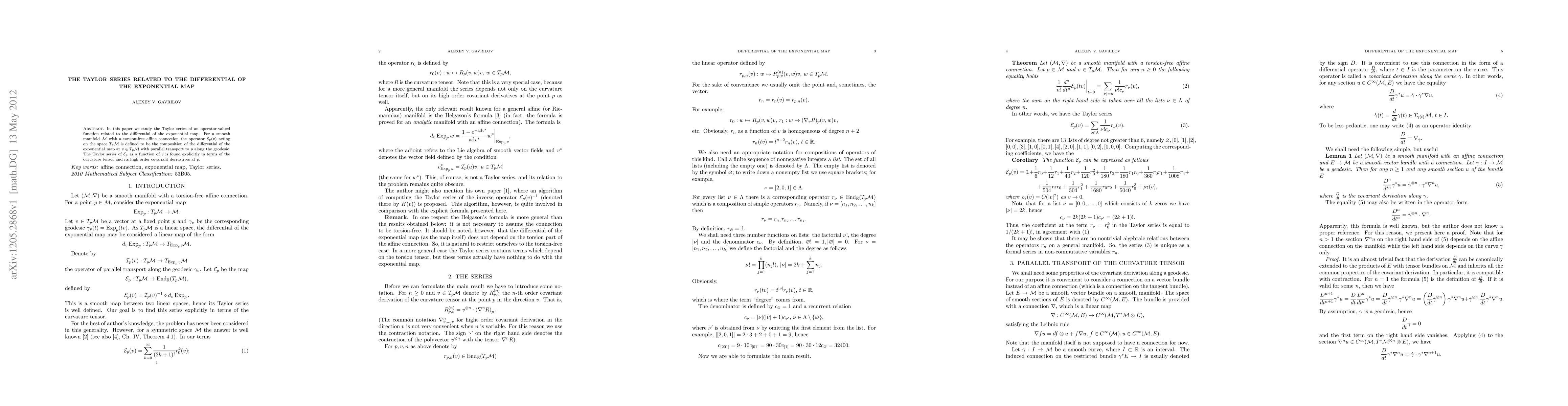 This paper investigates the Taylor series expansion of an operator-valued function associated with the differential of the exponential map on a smooth manifold with a torsion-free affine connection. The series is explicitly expressed in terms of the curvature tensor and its higher order covariant derivatives at a given point.