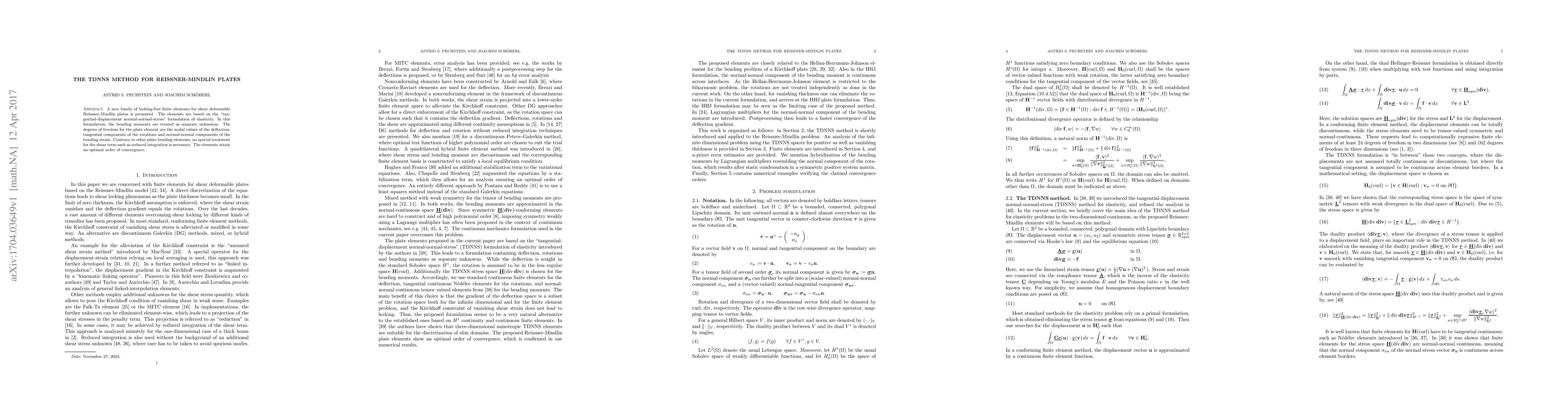 The TDNNS method introduces a new family of locking-free finite elements for shear deformable Reissner-Mindlin plates based on a tangential-displacement normal-normal-stress formulation, treating bending moments as separate unknowns and achieving optimal convergence without special shear treatment.