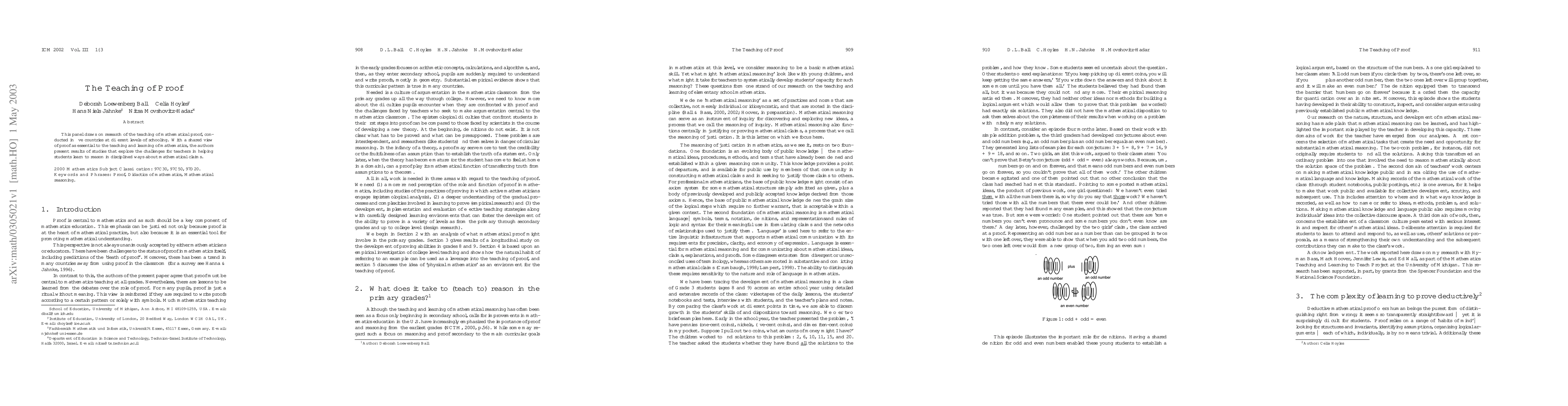 This panel draws on research of the teaching of mathematical proof, conducted in five countries at different levels of schooling. With a shared view of proof as essential to the teaching and learning of mathematics, the authors present results of studies that explore the challenges for teachers in helping students learn to reason in disciplined ways about mathematical claims.