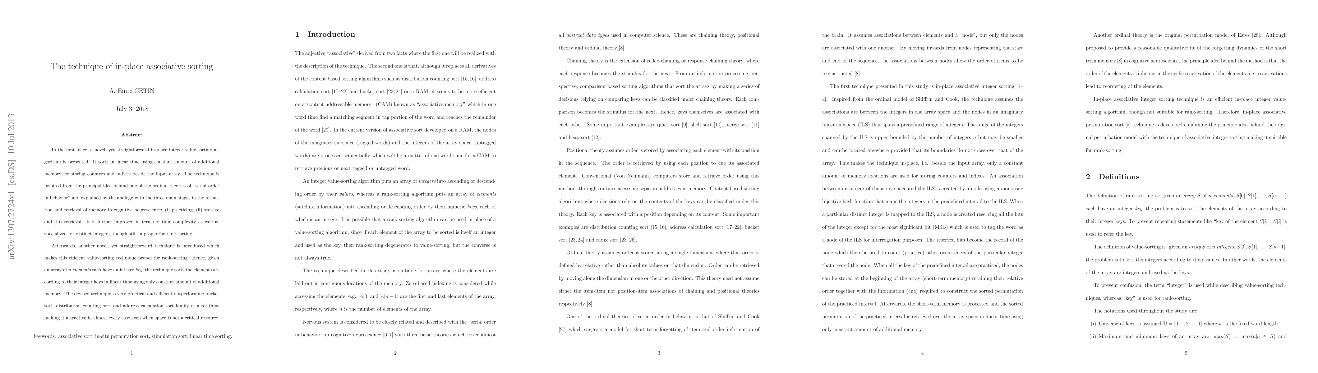 In the first place, a novel, yet straightforward in-place integer value-sorting algorithm is presented. It sorts in linear time using constant amount of additional memory for storing counters and indices beside the input array. The technique is inspired from the principal idea behind one of the ordinal theories of "serial order in behavior" and explained by the analogy with the three main stages in the formation and retrieval of memory in cognitive neuroscience: (i) practicing, (ii) storage and (iii) retrieval. It is further improved in terms of time complexity as well as specialized for distinct integers, though still improper for rank-sorting. Afterwards, another novel, yet straightforward technique is introduced which makes this efficient value-sorting technique proper for rank-sorting. Hence, given an array of n elements each have an integer key, the technique sorts the elements according to their integer keys in linear time using only constant amount of additional memory. The devised technique is very practical and efficient outperforming bucket sort, distribution counting sort and address calculation sort family of algorithms making it attractive in almost every case even when space is not a critical resource.
