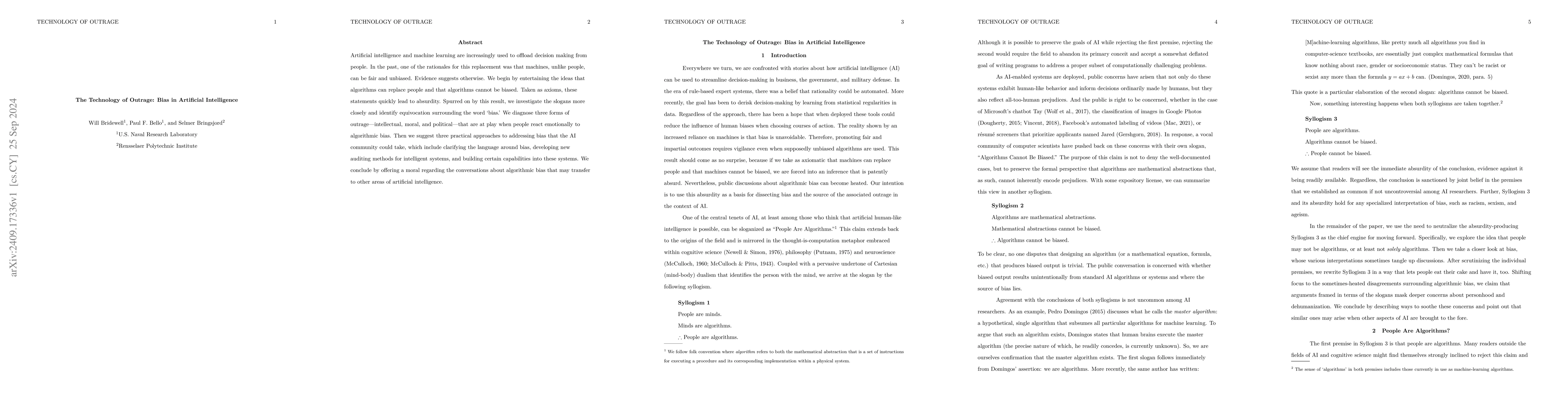 This paper explores how artificial intelligence (AI) systems, despite claims of impartiality, can perpetuate biases. It identifies three types of outrage—intellectual, moral, and political—stemming from algorithmic bias and proposes practical approaches for addressing it, including improved language clarity, new auditing methods, and inherent system capabilities.