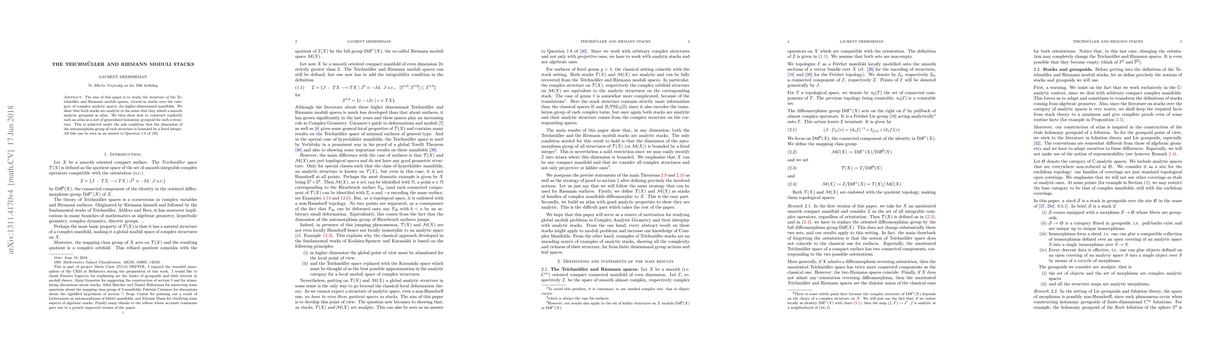 This paper investigates the structure of higher-dimensional Teichmüller and Riemann moduli spaces as stacks, demonstrating a foliation on smooth manifolds transverse to a translation groupoid. It constructs a holonomy groupoid, revealing finite-dimensional analytic spaces and smooth morphisms, and presents the moduli stacks as Artin analytic stacks under a bounded automorphism condition.