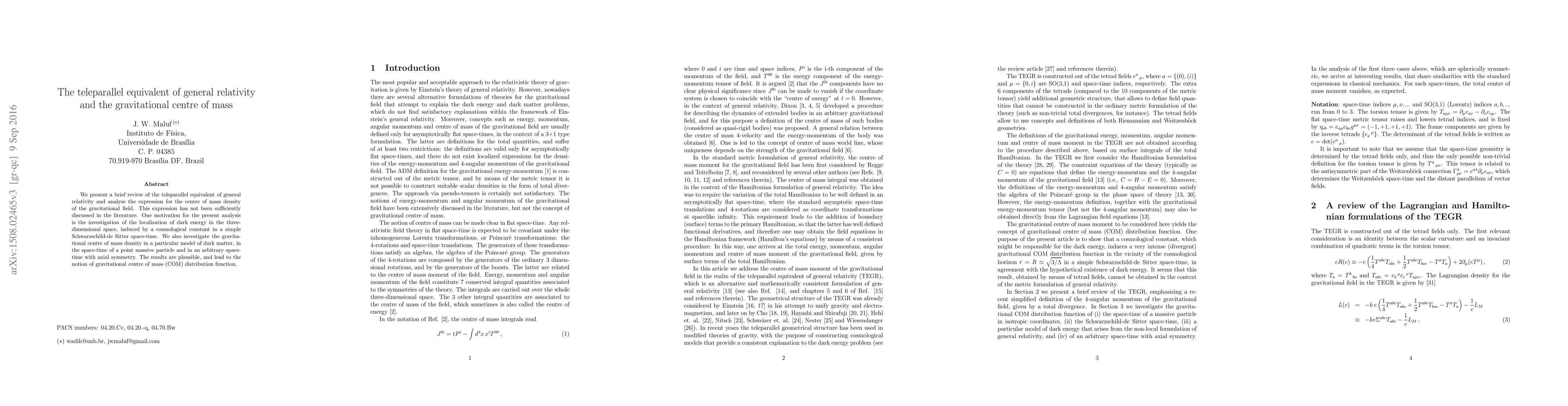 We present a brief review of the teleparallel equivalent of general relativity and analyse the expression for the centre of mass density of the gravitational field. This expression has not been sufficiently discussed in the literature. One motivation for the present analysis is the investigation of the localization of dark energy in the three-dimensional space, induced by a cosmological constant in a simple Schwarzschild-de Sitter space-time. We also investigate the gravitational centre of mass density in a particular model of dark matter, in the space-time of a point massive particle and in an arbitrary space-time with axial symmetry. The results are plausible, and lead to the notion of gravitational centre of mass (COM) distribution function.