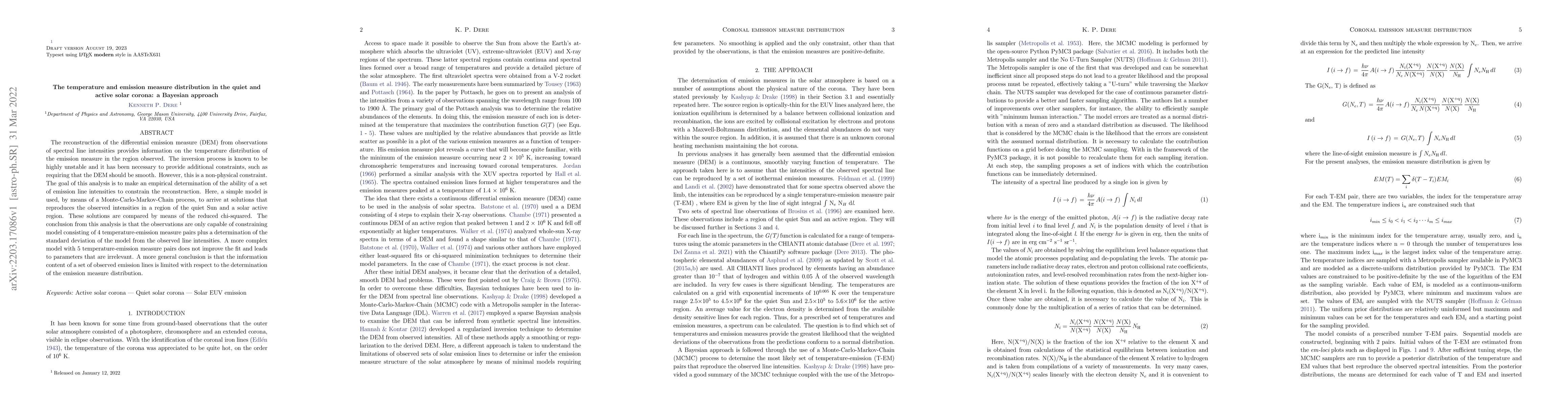 A Bayesian approach finds that a simple model with 4 temperature-emission measure pairs can accurately reproduce observed spectral line intensities in quiet and active solar corona regions.