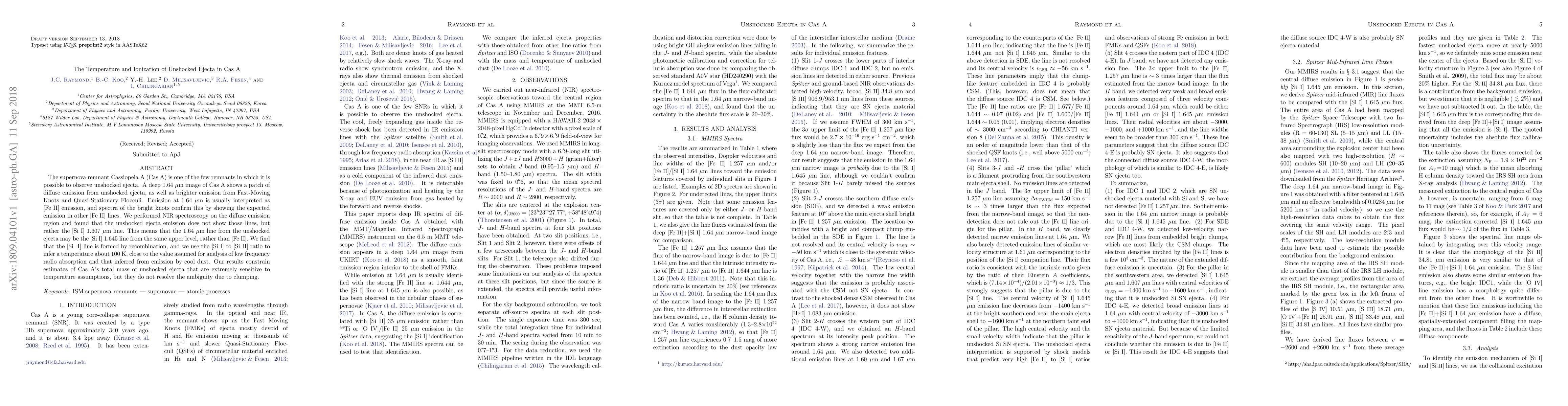 This study investigates the temperature and ionization state of unshocked ejecta in the supernova remnant Cas A, finding that the 1.64 micron emission likely originates from [Si I] rather than [Fe II]. The [Si I] to [Si II] ratio indicates a temperature of about 100 K, which aligns with previous low-frequency radio absorption and dust emission analyses.