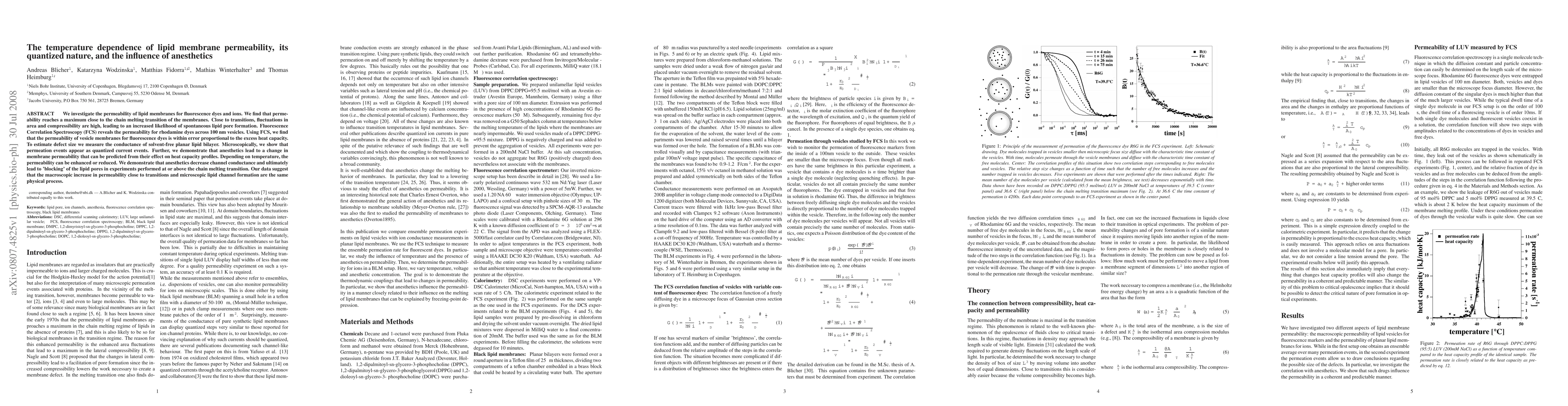 We investigate the permeability of lipid membranes for fluorescence dyes and ions. We find that permeability reaches a maximum close to the chain melting transition of the membranes. Close to transitions, fluctuations in area and compressibility are high, leading to an increased likelihood of spontaneous lipid pore formation. Fluorescence Correlation Spectroscopy (FCS) reveals the permeability for rhodamine dyes across 100 nm vesicles. Using FCS, we find that the permeability of vesicle membranes for fluorescence dyes is within error proportional to the excess heat capacity. To estimate defect size we measure the conductance of solvent-free planar lipid bilayer. Microscopically, we show that permeation events appear as quantized current events. Further, we demonstrate that anesthetics lead to a change in membrane permeability that can be predicted from their effect on heat capacity profiles. Depending on temperature, the permeability can be enhanced or reduced. We demonstrate that anesthetics decrease channel conductance and ultimately lead to 'blocking' of the lipid pores in experiments performed at or above the chain melting transition. Our data suggest that the macroscopic increase in permeability close to transitions and microscopic lipid channel formation are the same physical process.