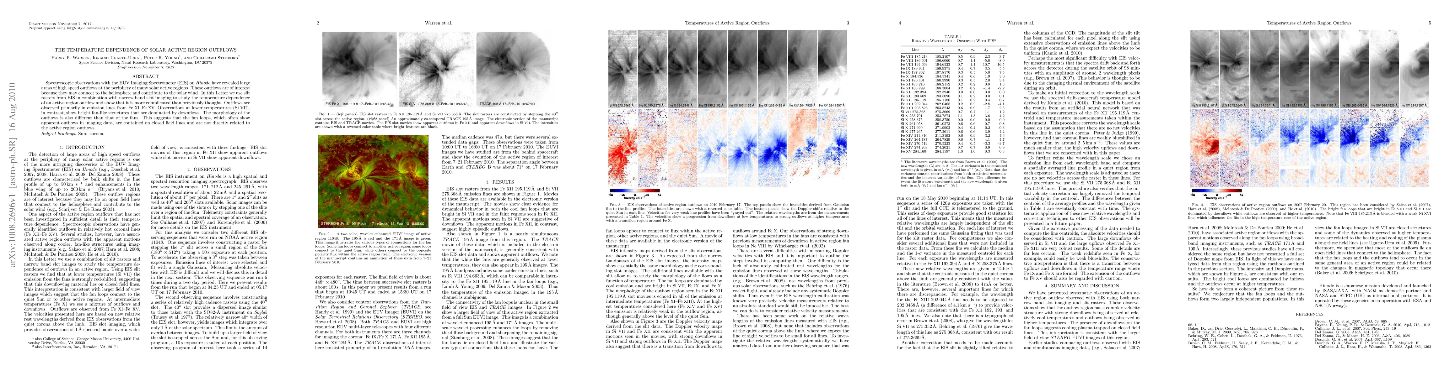 This paper investigates the temperature dependence of solar active region outflows using Hinode's EIS, revealing complex outflow behavior primarily in Fe XI - Fe XV emission lines, while lower temperature Si VII lines show fan-like structures dominated by downflows, indicating these fans are on closed field lines and not directly related to the outflows.