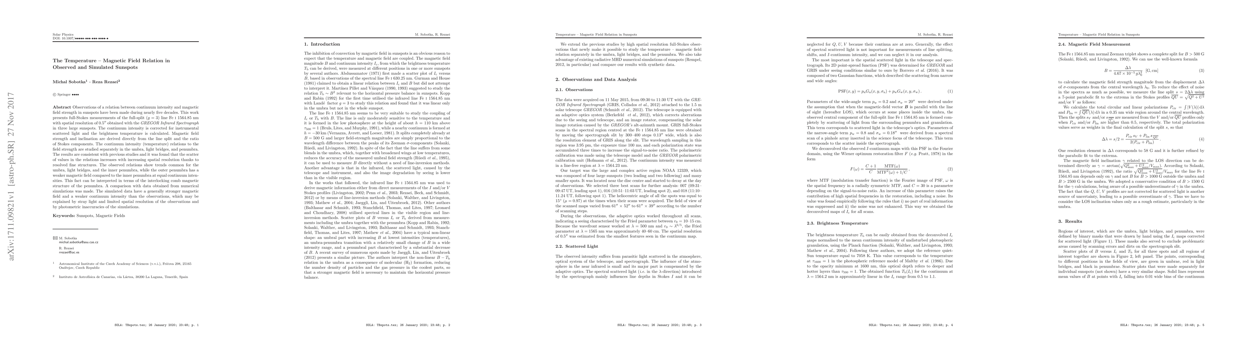 Observations of a relation between continuum intensity and magnetic field strength in sunspots have been made during nearly five decades. This work presents full-Stokes measurements of the full-split (g = 3) line Fe I 1564.85 nm with spatial resolution of 0.5" obtained with the GREGOR Infrared Spectrograph in three large sunspots. The continuum intensity is corrected for instrumental scattered light and the brightness temperature is calculated. Magnetic field strength and inclination are derived directly from the line split and the ratio of Stokes components. The continuum intensity (temperature) relations to the field strength are studied separately in the umbra, light bridges, and penumbra. The results are consistent with previous studies and it was found that the scatter of values in the relations increases with increasing spatial resolution thanks to resolved fine structures. The observed relations show trends common for the umbra, light bridges, and the inner penumbra, while the outer penumbra has a weaker magnetic field compared to the inner penumbra at equal continuum intensities. This fact can be interpreted in terms of the interlocking comb magnetic structure of the penumbra. A comparison with data obtained from numerical simulations was made. The simulated data have a generally stronger magnetic field and a weaker continuum intensity than the observations, which may be explained by stray light and limited spatial resolution of the observations and by photometric inaccuracies of the simulations.