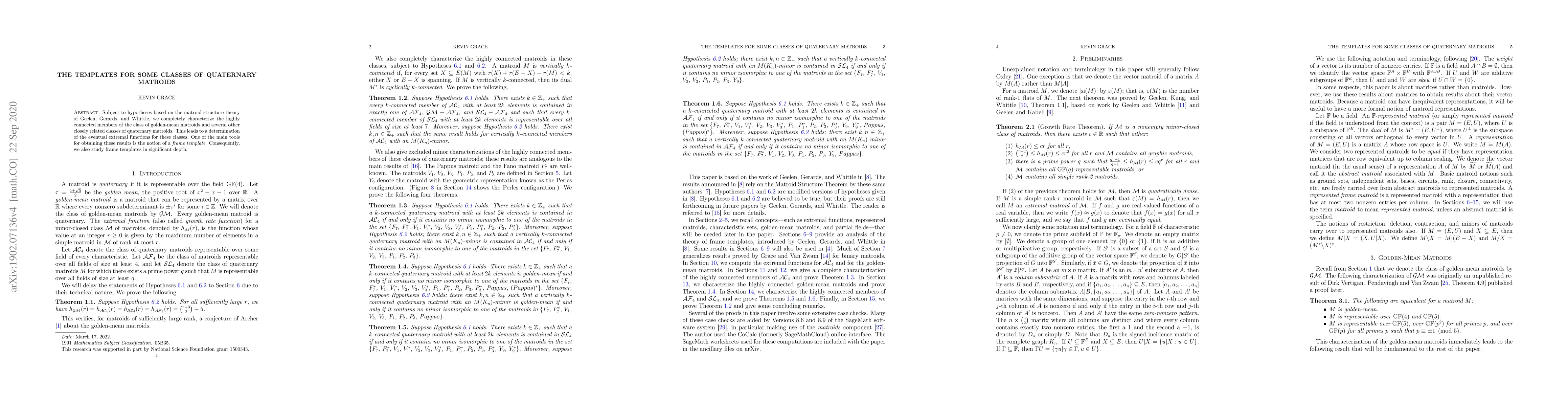 Subject to hypotheses based on the matroid structure theory of Geelen, Gerards, and Whittle, we completely characterize the highly connected members of the class of golden-mean matroids and several other closely related classes of quaternary matroids. This leads to a determination of the eventual extremal functions for these classes. One of the main tools for obtaining these results is the notion of a frame template. Consequently, we also study frame templates in significant depth.