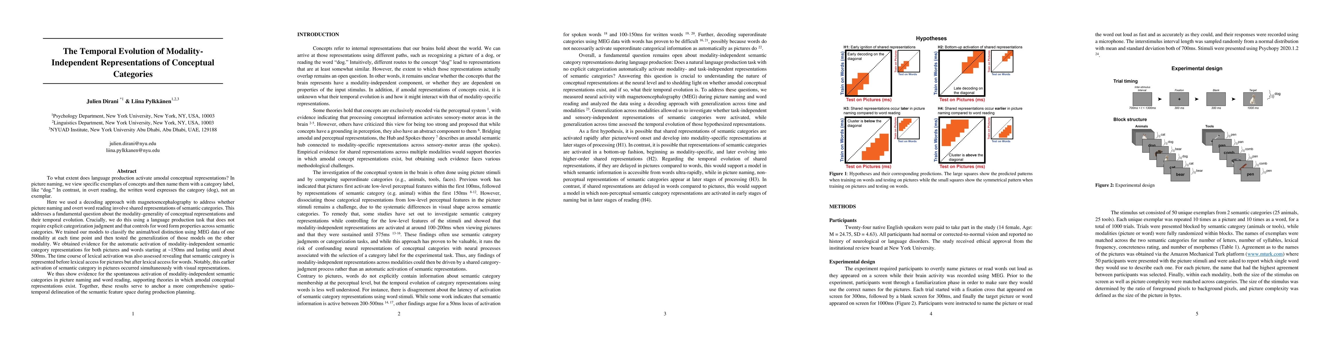 This study investigates the temporal evolution of modality-independent semantic representations during picture naming and overt word reading using magnetoencephalography. Findings reveal automatic activation of these representations starting around 150ms and lasting until 500ms, supporting the existence of amodal conceptual representations. Semantic categories are activated before lexical access for pictures and after for words.