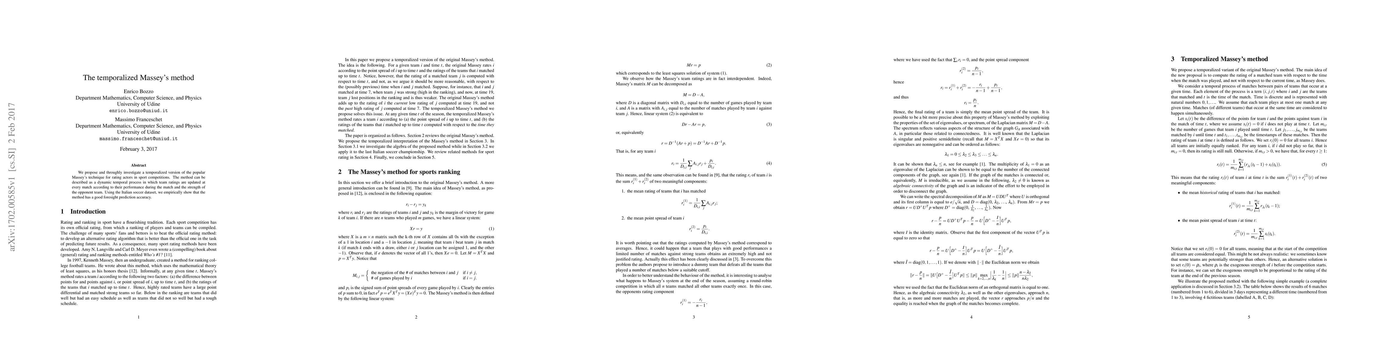 We propose and throughly investigate a temporalized version of the popular Massey's technique for rating actors in sport competitions. The method can be described as a dynamic temporal process in which team ratings are updated at every match according to their performance during the match and the strength of the opponent team. Using the Italian soccer dataset, we empirically show that the method has a good foresight prediction accuracy.