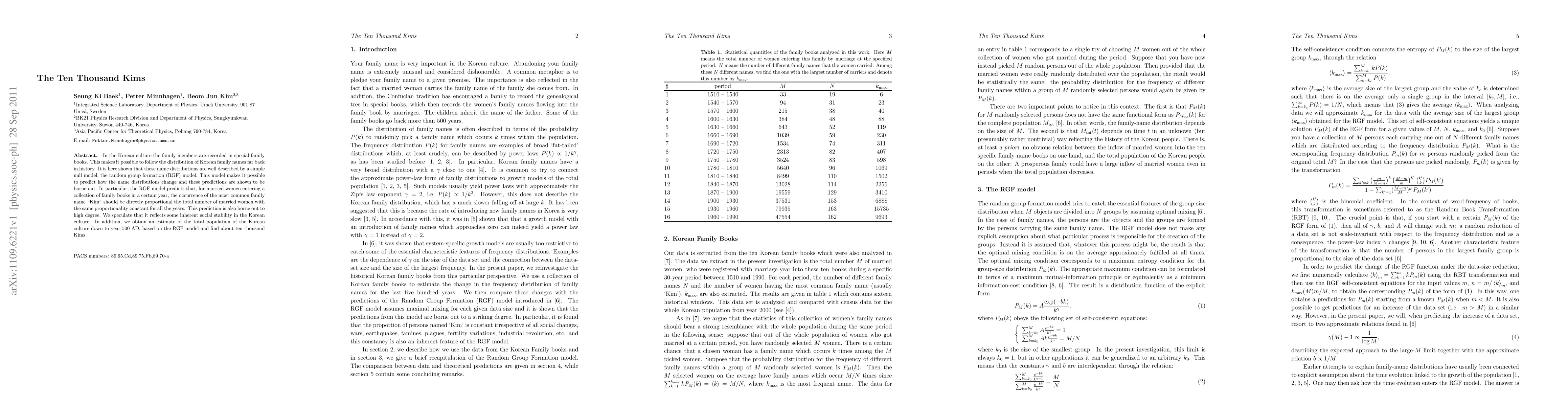 In the Korean culture the family members are recorded in special family books. This makes it possible to follow the distribution of Korean family names far back in history. It is here shown that these name distributions are well described by a simple null model, the random group formation (RGF) model. This model makes it possible to predict how the name distributions change and these predictions are shown to be borne out. In particular, the RGF model predicts that, for married women entering a collection of family books in a certain year, the occurrence of the most common family name "Kim" should be directly proportional the total number of married women with the same proportionality constant for all the years. This prediction is also borne out to high degree. We speculate that it reflects some inherent social stability in the Korean culture. In addition, we obtain an estimate of the total population of the Korean culture down to year 500 AD, based on the RGF model and find about ten thousand Kims.