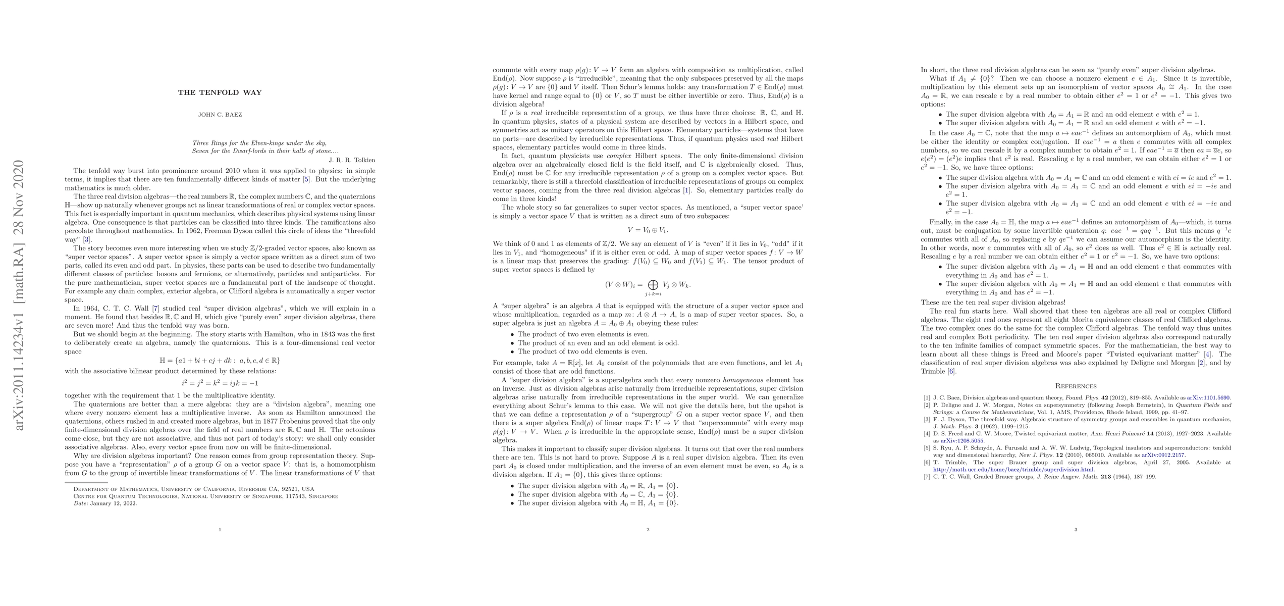 The tenfold way classifies ten fundamentally different kinds of real super division algebras, originating from C. T. C. Wall's 1964 classification of real $\mathbb{Z}/2$-graded algebras. It unifies real and complex Bott periodicity through the identification of these algebras as real or complex Clifford algebras.