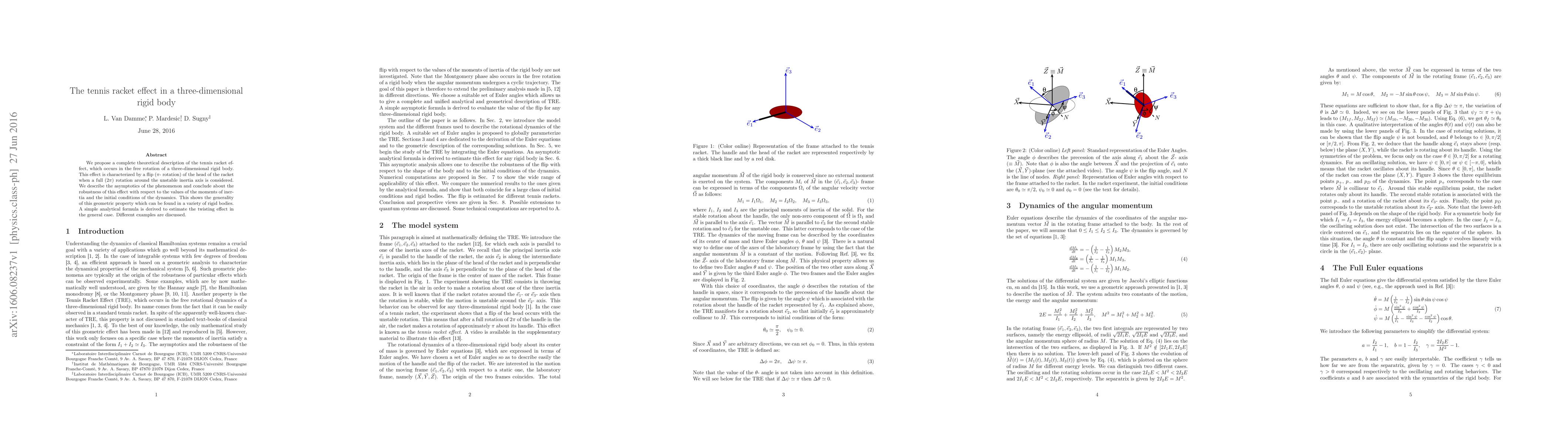 We propose a complete theoretical description of the tennis racket effect, which occurs in the free rotation of a three-dimensional rigid body. This effect is characterized by a flip ($\pi$- rotation) of the head of the racket when a full ($2\pi$) rotation around the unstable inertia axis is considered. We describe the asymptotics of the phenomenon and conclude about the robustness of this effect with respect to the values of the moments of inertia and the initial conditions of the dynamics. This shows the generality of this geometric property which can be found in a variety of rigid bodies. A simple analytical formula is derived to estimate the twisting effect in the general case. Different examples are discussed.