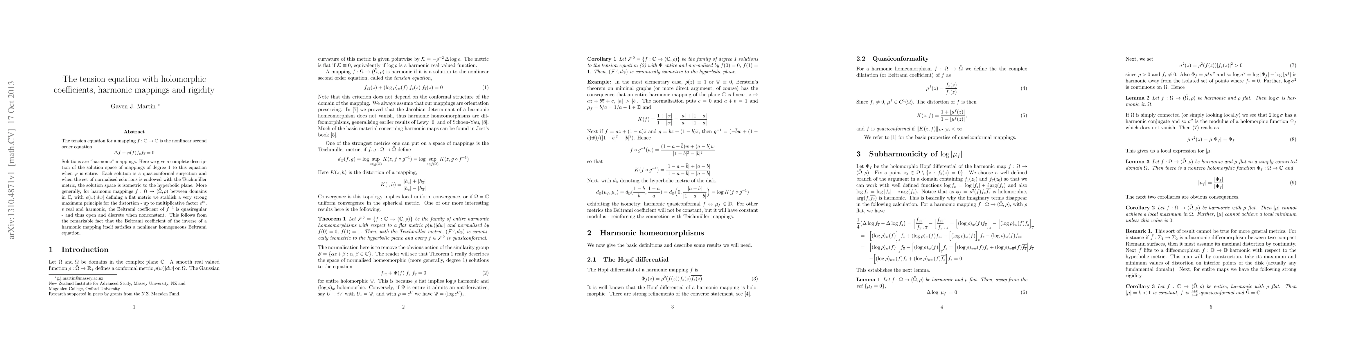 The tension equation for a mapping $f:{\mathbb C}\to {\mathbb C}$ is the nonlinear second order equation \[ \Delta f +\varphi(f) f_z f_{\bar z} = 0\] Solutions are "harmonic" mappings. Here we give a complete description of the solution space of mappings of degree 1 to this equation when $\varphi$ is entire. Each solution is a quasiconformal surjection and when the set of normalised solutions is endowed with the Teichm\"uller metric, the solution space is isometric to the hyperbolic plane. More generally, for harmonic mappings $f:\Omega \to (\tilde{\Omega},\rho)$ between domains in ${\mathbb C}$, with $\rho(w)|dw|$ defining a flat metric we stablish a very strong maximum principle for the distortion - up to multiplicative factor $e^{iv}$, $v$ real and harmonic, the Beltrami coefficient of $f^{-1}$ is quasiregular - and thus open and discrete when nonconstant. This follows from the remarkable fact that the Beltrami coefficient of the inverse of a harmonic mapping itself satisfies a nonlinear homogeneous Beltrami equation.