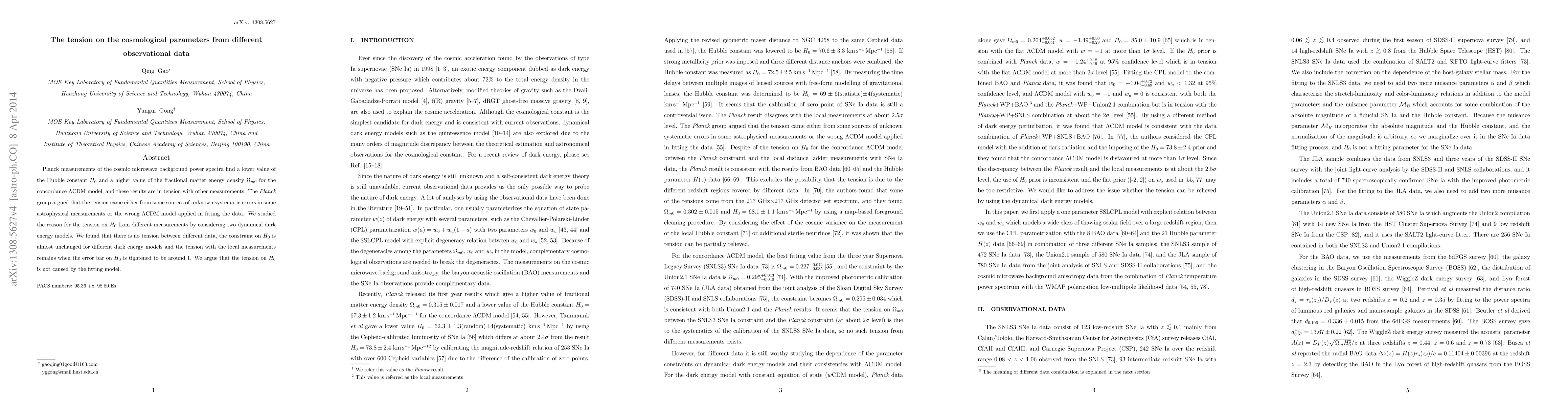 Planck measurements of the cosmic microwave background power spectra find a lower value of the Hubble constant $H_0$ and a higher value of the fractional matter energy density $\Omega_{m0}$ for the concordance $\Lambda$CDM model, and these results are in tension with other measurements. The {\em Planck} group argued that the tension came either from some sources of unknown systematic errors in some astrophysical measurements or the wrong $\Lambda$CDM model applied in fitting the data. We studied the reason for the tension on $H_0$ from different measurements by considering two dynamical dark energy models. We found that there is no tension between different data, the constraint on $H_0$ is almost unchanged for different dark energy models and the tension with the local measurements remains when the error bar on $H_0$ is tightened to be around 1. We argue that the tension on $H_0$ is not caused by the fitting model.