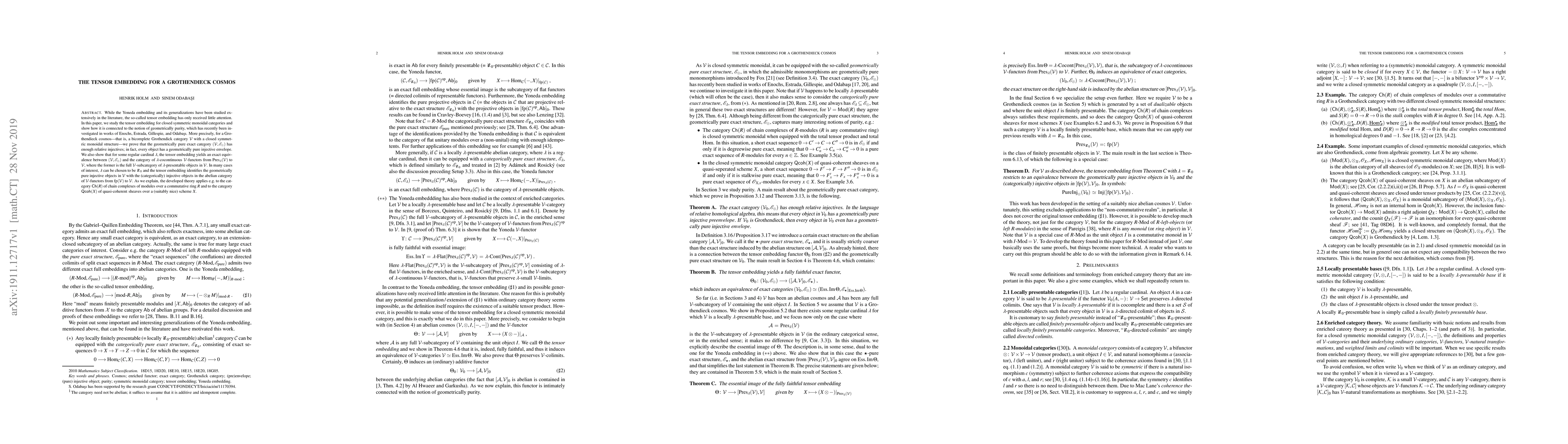 While the Yoneda embedding and its generalizations have been studied extensively in the literature, the so-called tensor embedding has only received little attention. In this paper, we study the tensor embedding for closed symmetric monoidal categories and show how it is connected to the notion of geometrically purity, which has recently been investigated in works of Enochs, Estrada, Gillespie, and Odaba\c{s}{\i}. More precisely, for a Gro\-thendieck cosmos---that is, a bicomplete Grothendick category $\mathcal{V}$ with a closed symmetric monoidal structure---we prove that the geometrically pure exact category $(\mathcal{V},\mathscr{E}_\otimes)$ has enough relative injectives; in fact, every object has a geometrically pure injective envelope. We also show that for some regular cardinal $\lambda$, the tensor embedding yields an exact equivalence between $(\mathcal{V},\mathscr{E}_\otimes)$ and the category of $\lambda$-cocontinuous $\mathcal{V}$-functors from $\mbox{Pres}(\mathcal{V})$ to $\mathcal{V}$, where the former is the full $\mathcal{V}$-subcategory of $\lambda$-presentable objects in $\mathcal{V}$. In many cases of interest, $\lambda$ can be chosen to be $\aleph_0$ and the tensor embedding identifies the geometrically pure injective objects in $\mathcal{V}$ with the (categorically) injective objects in the abelian category of $\mathcal{V}$-functors from $\mathrm{fp}(\mathcal{V})$ to $\mathcal{V}$. As we explain, the developed theory applies e.g.~to the category $\mathsf{Ch}(R)$ of chain complexes of modules over a commutative ring $R$ and to the category $\mathsf{Qcoh}(X)$ of quasi-coherent sheaves over a (suitably nice) scheme $X$.