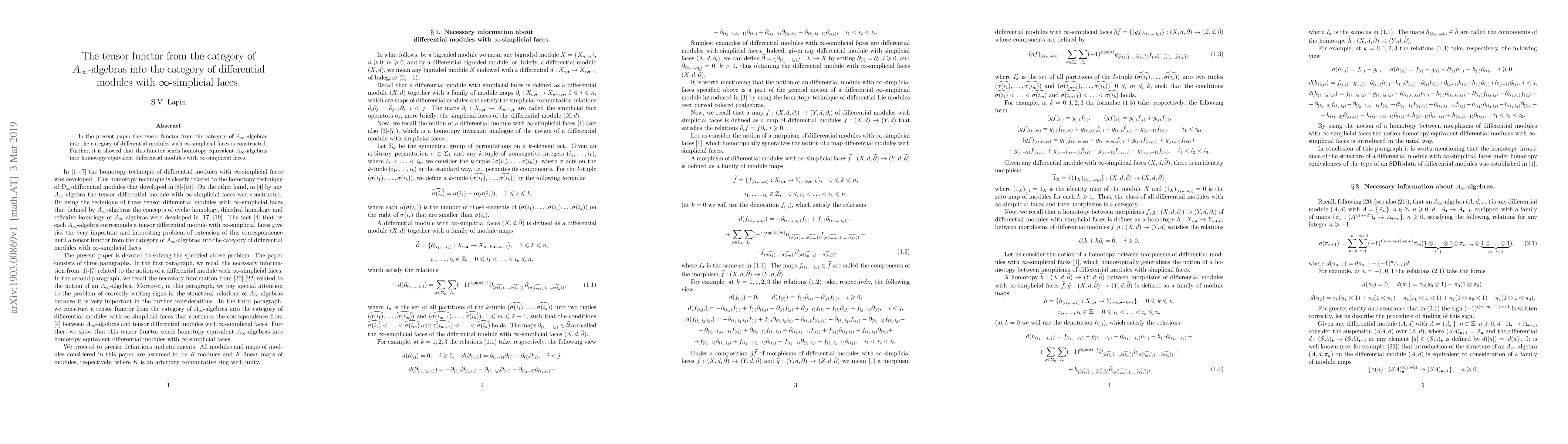 This paper constructs a tensor functor mapping $A_\infty$-algebras to differential modules with $\infty$-simplicial faces and demonstrates that it preserves homotopy equivalence between the input and output structures.