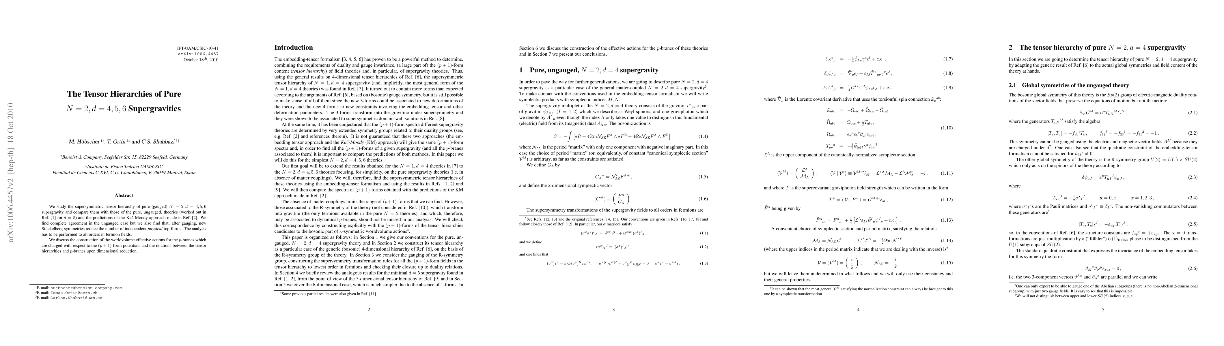 We study the supersymmetric tensor hierarchy of pure (gauged) N=2,d=4,5,6 supergravity and compare them with those of the pure, ungauged, theories (worked out by Gomis and Roest for d=5) and the predictions of the Kac-Moody approach made by Kleinschmidt and Roest. We find complete agreement in the ungauged case but we also find that, after gauging, new Stueckelberg symmetries reduce the number of independent "physical" top-forms. The analysis has to be performed to all orders in fermion fields. We discuss the construction of the worldvolume effective actions for the p-branes which are charged with respect to the (p+1)-form potentials and the relations between the tensor hierarchies and p-branes upon dimensional reduction.