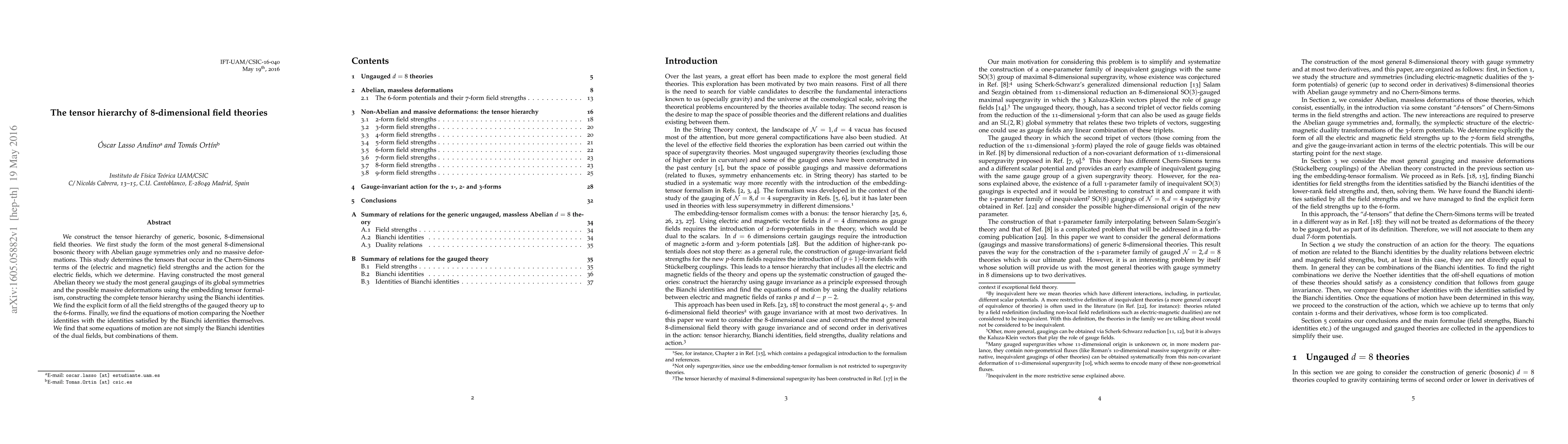 We construct the tensor hierarchy of generic, bosonic, 8-dimensional field theories. We first study the form of the most general 8-dimensional bosonic theory with Abelian gauge symmetries only and no massive deformations. This study determines the tensors that occur in the Chern-Simons terms of the (electric and magnetic) field strengths and the action for the electric fields, which we determine. Having constructed the most general Abelian theory we study the most general gaugings of its global symmetries and the possible massive deformations using the embedding tensor formalism, constructing the complete tensor hierarchy using the Bianchi identities. We find the explicit form of all the field strengths of the gauged theory up to the 6-forms. Finally, we find the equations of motion comparing the Noether identities with the identities satisfied by the Bianchi identities themselves. We find that some equations of motion are not simply the Bianchi identities of the dual fields, but combinations of them.