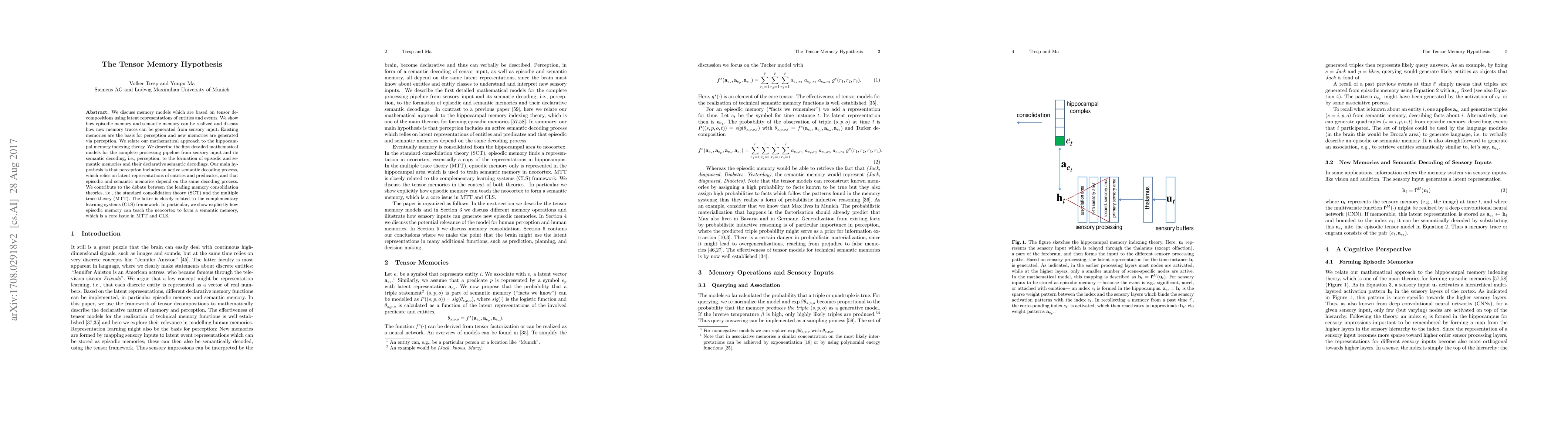 The Tensor Memory Hypothesis proposes that episodic and semantic memories are generated through tensor decompositions of latent representations, with perception involving active semantic decoding. It supports the multiple trace theory by demonstrating how episodic memory aids in forming semantic memory.
