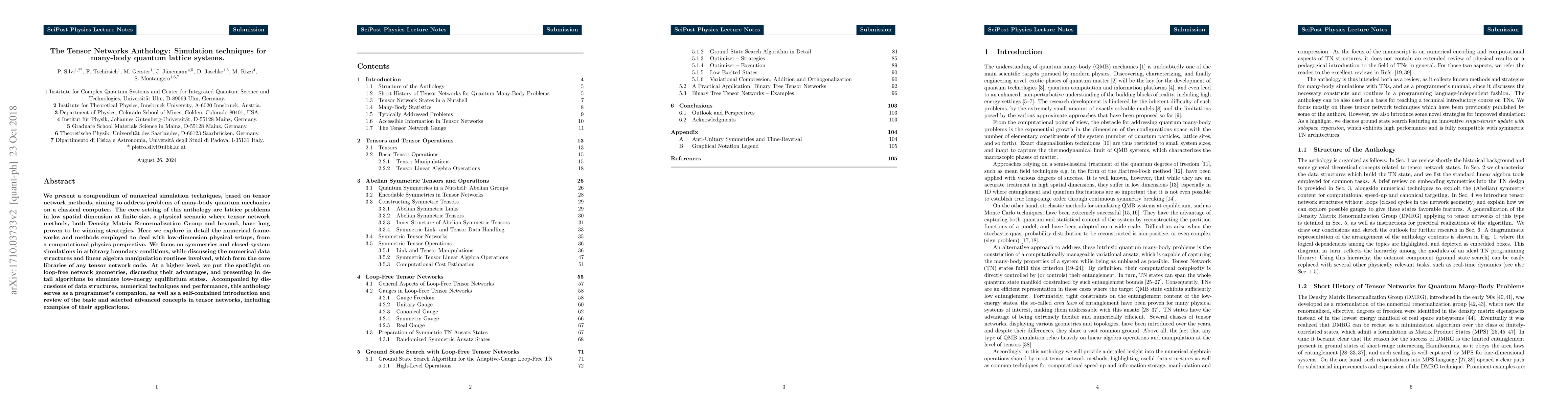 We present a compendium of numerical simulation techniques, based on tensor network methods, aiming to address problems of many-body quantum mechanics on a classical computer. The core setting of this anthology are lattice problems in low spatial dimension at finite size, a physical scenario where tensor network methods, both Density Matrix Renormalization Group and beyond, have long proven to be winning strategies. Here we explore in detail the numerical frameworks and methods employed to deal with low-dimension physical setups, from a computational physics perspective. We focus on symmetries and closed-system simulations in arbitrary boundary conditions, while discussing the numerical data structures and linear algebra manipulation routines involved, which form the core libraries of any tensor network code. At a higher level, we put the spotlight on loop-free network geometries, discussing their advantages, and presenting in detail algorithms to simulate low-energy equilibrium states. Accompanied by discussions of data structures, numerical techniques and performance, this anthology serves as a programmer's companion, as well as a self-contained introduction and review of the basic and selected advanced concepts in tensor networks, including examples of their applications.