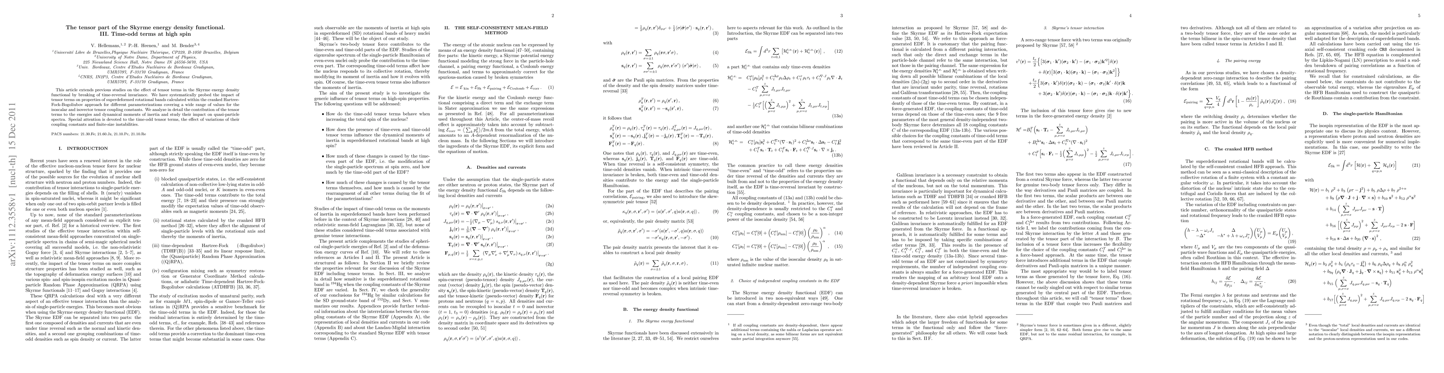 This paper investigates the influence of tensor terms in the Skyrme energy density functional on superdeformed rotational bands, focusing on time-odd terms and their effects on energy, moments of inertia, and quasi-particle spectra at high spin using the cranked Hartree-Fock-Bogoliubov approach. Special emphasis is placed on the impact of time-odd tensor terms and their coupling constants on finite-size instabilities.