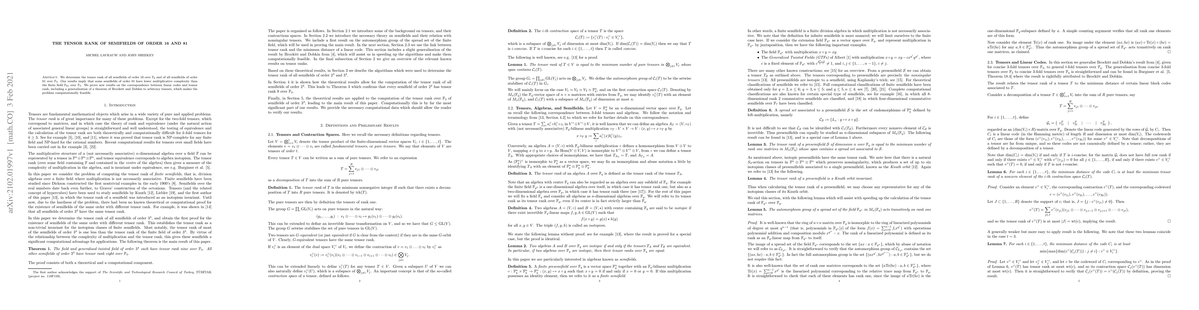 We determine the tensor rank of all semifields of order 16 over $\mathbb{F}_2$ and of all semifields of order 81 over $\mathbb{F}_3$. Our results imply that some semifields of order 81 have lower multiplicative complexity than the finite field $\mathbb{F}_{81}$ over $\mathbb{F}_3$. We prove new results on the correspondence between linear codes and tensor rank, including a generalisation of a theorem of Brockett and Dobkin to arbitrary tensors, which makes the problem computationally feasible.