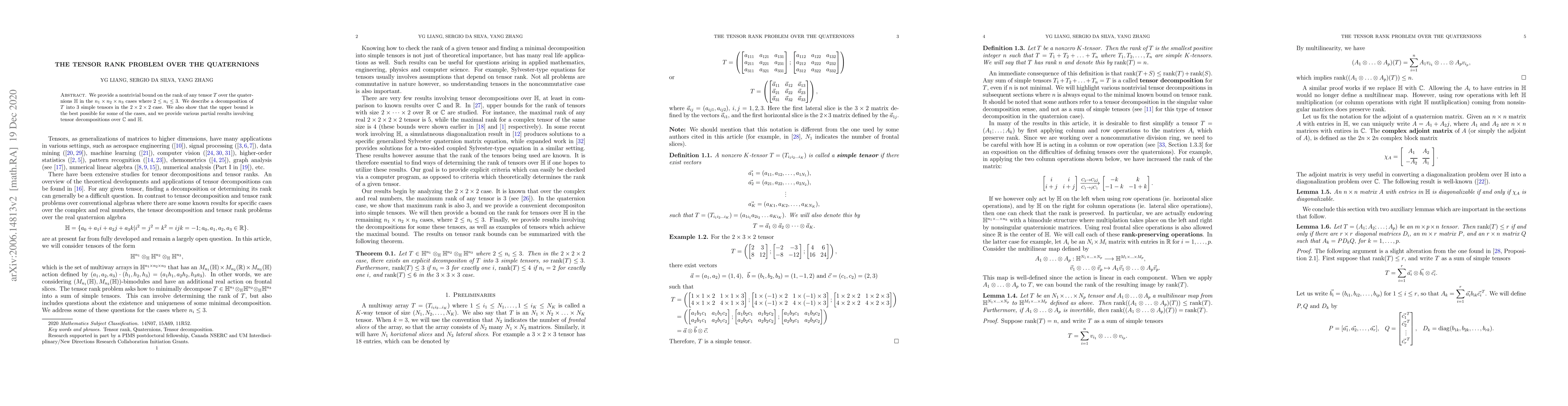 Researchers provide a nontrivial bound on the rank of tensors over quaternions in 2x3 cases and demonstrate a decomposition into simple tensors in the 2x2x2 case.