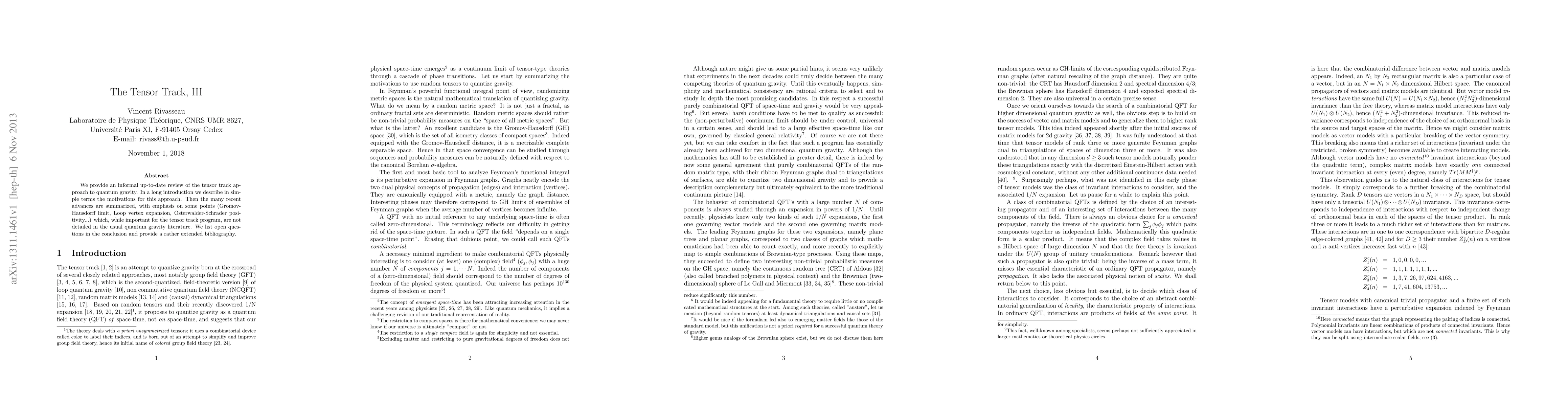 We provide an informal up-to-date review of the tensor track approach to quantum gravity. In a long introduction we describe in simple terms the motivations for this approach. Then the many recent advances are summarized, with emphasis on some points (Gromov-Hausdorff limit, Loop vertex expansion, Osterwalder-Schrader positivity...) which, while important for the tensor track program, are not detailed in the usual quantum gravity literature. We list open questions in the conclusion and provide a rather extended bibliography.