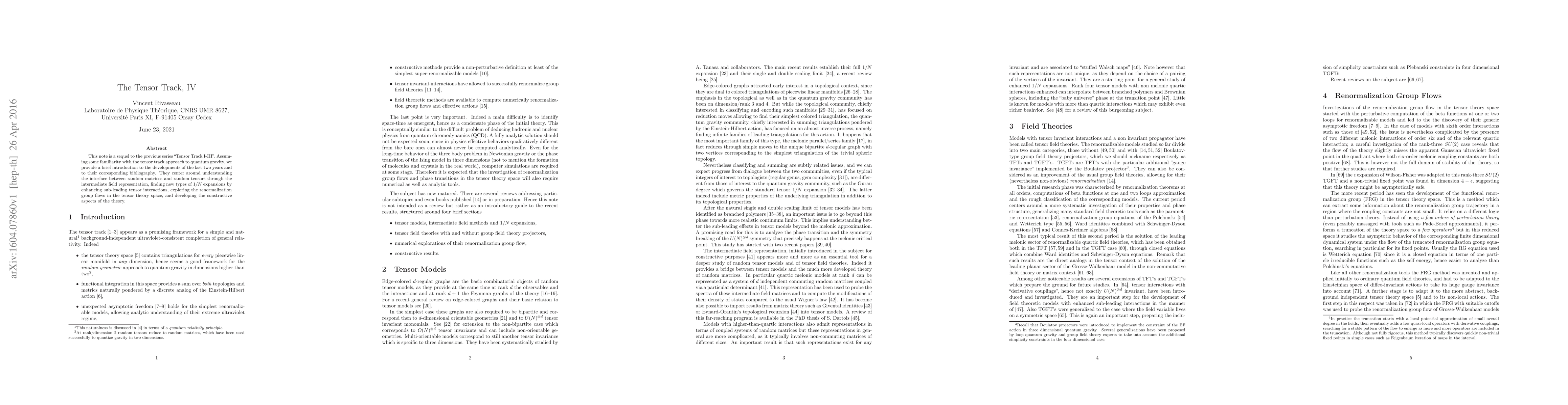 This note is a sequel to the previous series "Tensor Track I-III". Assuming some familiarity with the tensor track approach to quantum gravity, we provide a brief introduction to the developments of the last two years and to their corresponding bibliography. They center around understanding the interface between random matrices and random tensors through the intermediate field representation, finding new types of $1/N$ expansions by enhancing sub-leading tensor interactions, exploring the renormalization group flows in the tensor theory space, and developing the constructive aspects of the theory.