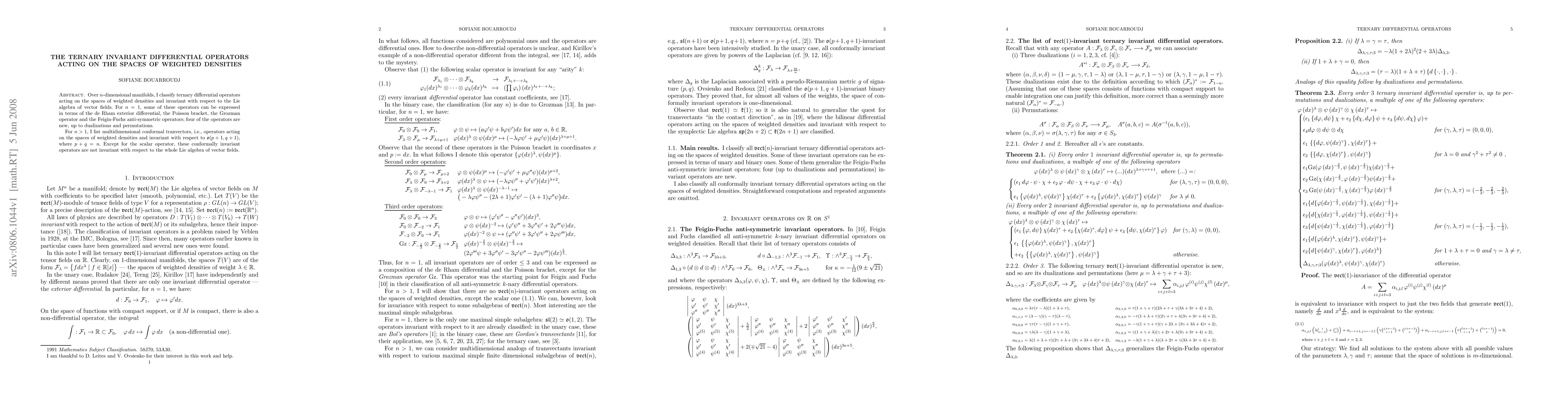 This paper classifies ternary differential operators on n-dimensional manifolds that act on weighted densities and are invariant under the Lie algebra of vector fields. For n=1, it identifies four new operators alongside known ones, while for n>1, it lists multidimensional conformal tranvectors invariant under o(p+1,q+1).