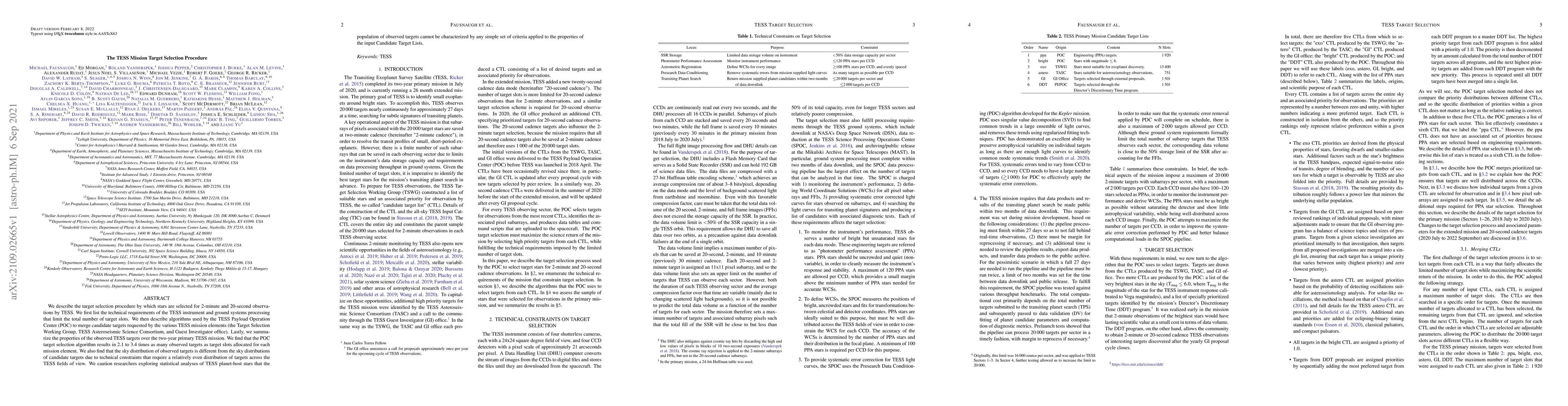 The TESS Mission Target Selection Procedure outlines the algorithms used to select stars for observation, resulting in 2-3 times more targets than available slots, and highlights the non-uniform sky distribution due to technical constraints. Researchers are cautioned that the observed target population cannot be fully characterized by the initial candidate criteria.