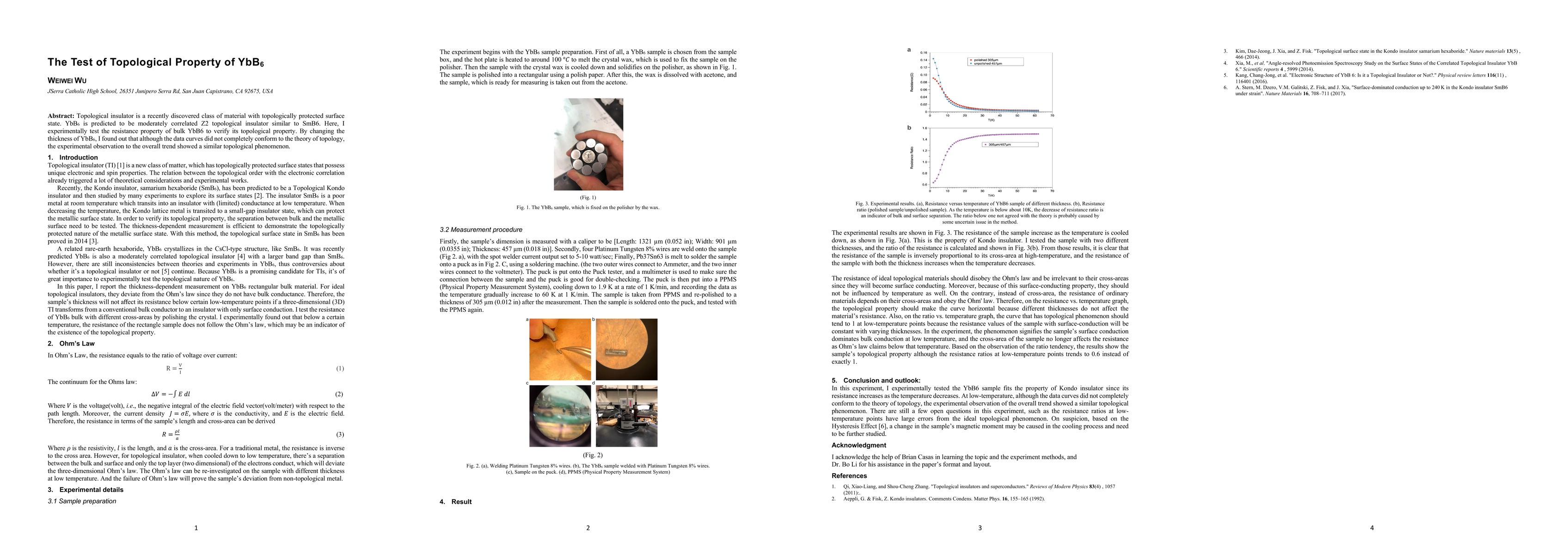 Topological insulator is a recently discovered class of material with topologically protected surface state. YbB6 is predicted to be moderately correlated Z2 topological insulator similar to SmB6. Here, I experimentally test the resistance property of bulk YbB6 to verify its topological property. By changing the thickness of YbB6, I found out that although the data curves did not completely conform to the theory of topology, the experimental observation to the overall trend showed a similar topological phenomenon.
